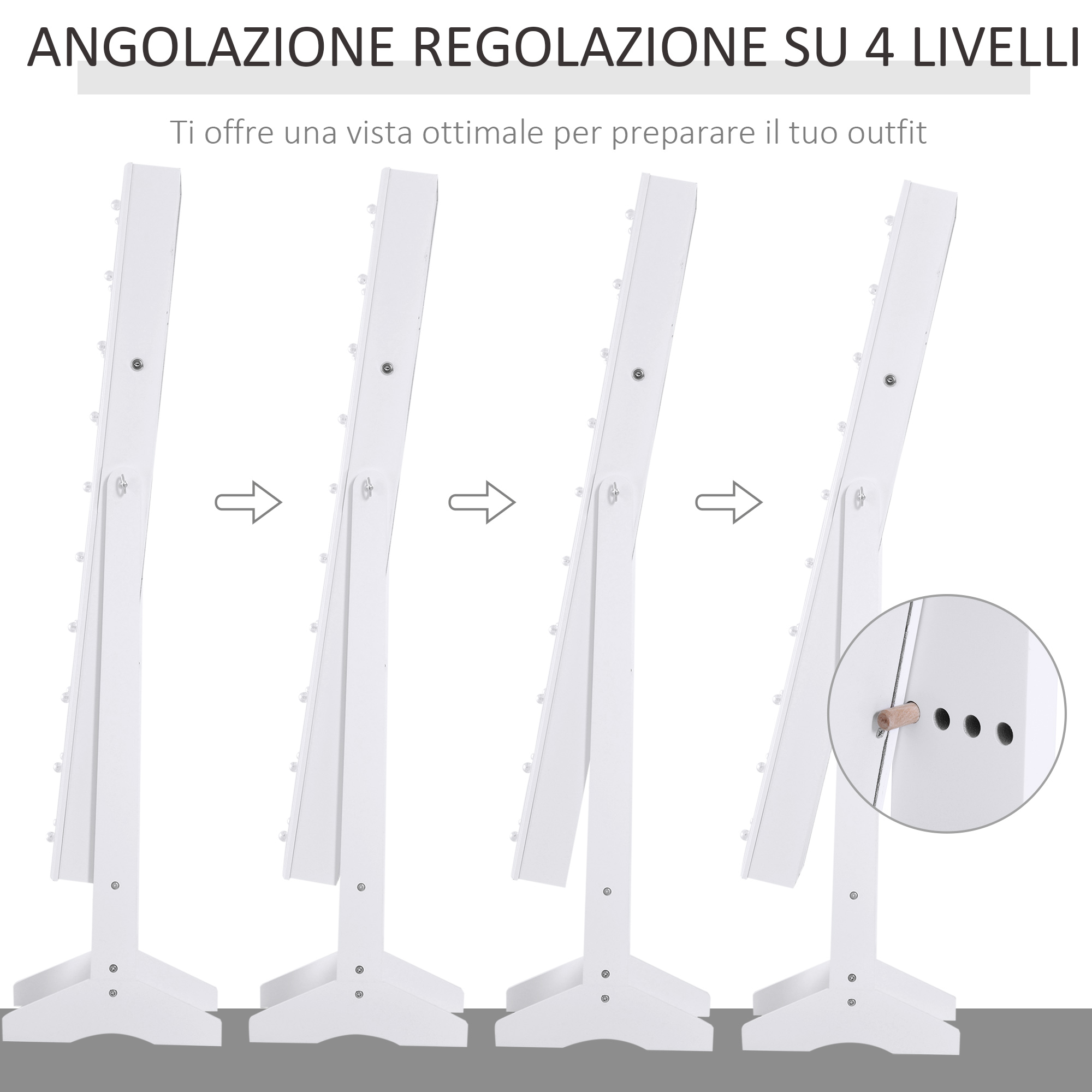 Questo armadio a specchio è la soluzione ideale per mantenere al sicuro e in ordine tutti i propri gioielli. È caratterizzato da illuminazione LED automatica con apertura e chiusura dell’armadio e specchio esterno regolabile in inclinazione. Dispone di 3 ripiani inferiori, 3 file di fori per orecchini, 5 ganci per collane, 3 asta per sciarpe, un sacchetto di immagazzinamento, 1 porta anelli, 9 portamatite, uno specchio e un tavolo pieghevole.Caratteristiche:• Ideale per camera da letto• Perfetto per organizzare tutti i gioielli e accessori• Dispone di 3 ripiani inferiori, 3 file di fori per orecchini, 5 ganci per collane, 3 asta per sciarpe, un sacchetto di immagazzinamento, 1 porta anelli, 9 portamatite, uno specchio e un tavolo pieghevole• Illuminazione LED automatica• Realizzato in MDF di alta qualità per un uso duraturo• Specchio esterno regolabile• Richiesto assemblaggio sempliceNota: sono necessarie 6 batterie AA (non incluse). Dati tecnici:• Colore: bianco• Materiale: MDF, vetro• Dimensione complessiva: 30x146x36cm• Dimensioni armadio: 34x100x11.8cm• Capacità di peso: 10 kg• Peso netto: 11.2 kg• Tipo di batteria: 6 AA (non incluso)Contenuto della confezione:1 x Armadio Portagioie
