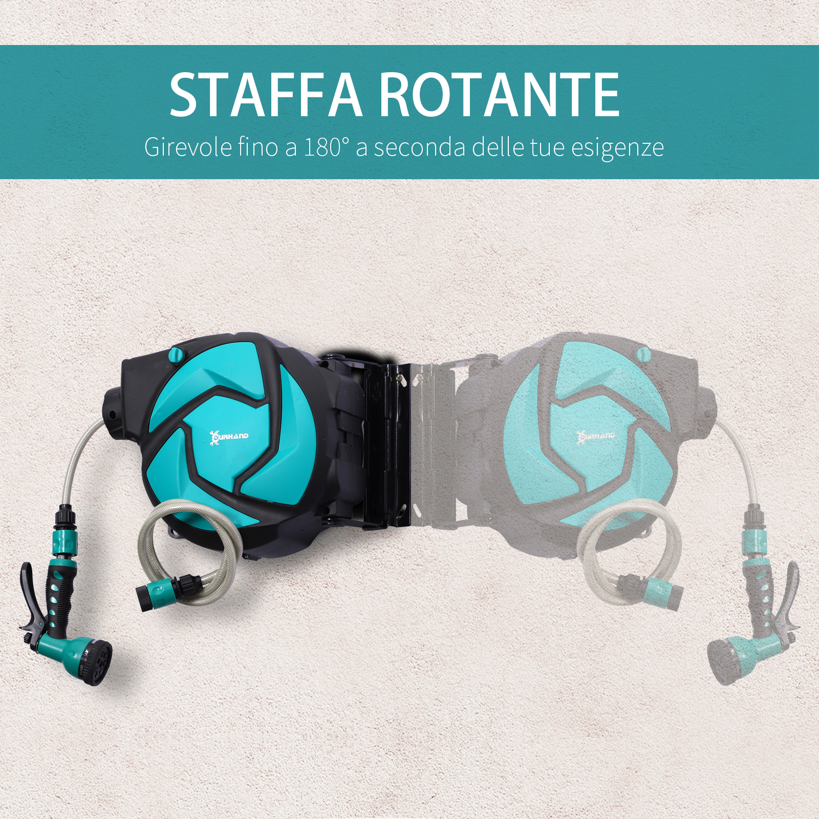 Questo avvolgitubo a parete in plastica ti permette di lavare tanti oggetti e superfici all’esterno. Grazie al sistema di riavvolgimento a guida automatica, è possibile riavvolgere il tubo in modo fluido senza che si attorcigli, mentre il meccanismo di aggancio blocca automaticamente il tubo alla lunghezza desiderata. Questo avvolgitubo è munito di un ugello con 7 modalità di irrigazione diverse per scegliere la soluzione più adatta alle proprie esigenze.Caratteristiche:• Avvolgitubo a parete pronto all’uso con tubo a riavvolgimento automatico da 15 m incluso• Tubo da giardino a molla lento e retrattile con blocco impostabile a qualsiasi lunghezza desiderata• Kit di montaggio incluso• Avvolgitubo ideale per l’uso in terrazza, patio, giardino o altri spazi all’aperto• Il nostro avvolgitubo automatico è dotato di un ugello a 7 modalità di irrigazione per offrirti la soluzione migliore a seconda dei casi• Nota: prima di riavvolgere il tubo, assicurarsi che l’acqua sia stata scaricata dall’interno. Conservare sempre il tubo e l’avvolgitubo al chiuso durante i mesi invernali per prolungare la durata e il funzionamento della struttura Dati tecnici:• Colore: Nero e verde• Materiale: Plastica• Dimensioni complessive: 44L x 22.5P x 41A cm• Lunghezza del tubo dell’acqua: 15 m• Pressione di esercizio: 10 bar• Pressione di scoppio: 30 barContenuto della confezione:•1 x Avvolgitubo•1 x Ugello•2 x Connettore del tubo•1 x Manuale di istruzioni•Viti per il montaggio a parete