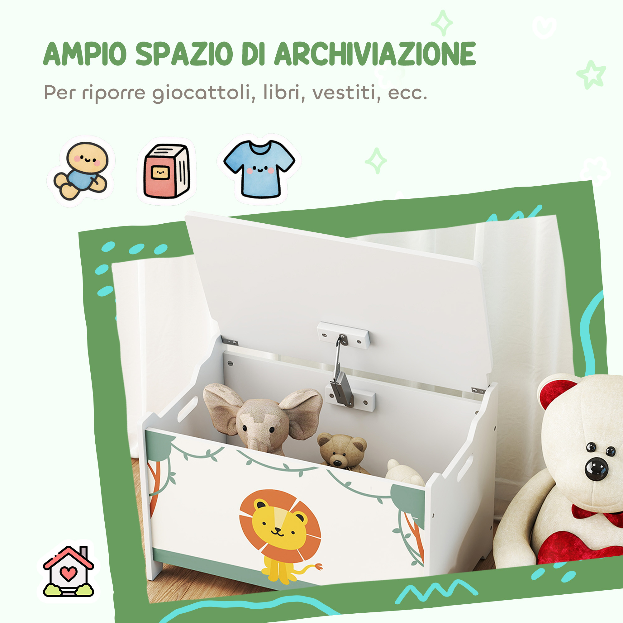 Il baule portagiochi , grande e capiente, organizza con facilità giocattoli, libri e abiti dei bambini, mantenendo l’ambiente ordinato. Con una capacità di 20 kg, ha una finitura verniciata e decorata che ne aumenta la resistenza e lo rende accattivante. Il sistema di cerniera di sicurezza evita chiusure brusche del coperchio, proteggendo le dita dei più piccoli durante l’uso quotidiano. Ideale per soggiorno, sala giochi, asilo, camera da letto e oltre.Caratteristiche:• Baule per giocattoli con ampio spazio di conservazione per giochi, libri e vestiti• Aiuta a sviluppare l’abitudine di tenere in ordine ed essere indipendenti nei bambini• Le cerniere di sicurezza impediscono la chiusura improvvisa del coperchio del baule portagiochi• Superficie dipinta e stampata per una maggiore bellezza• Contenitore portagiochi perfetto per l’uso in diversi ambienti• Supporta fino a 20 kg con una costruzione stabile• Adatto per bambini dai 3 agli 8 anni• Montaggio necessarioDati tecnici:• Colore: Rosa• Materiale: MDF• Dimensioni complessive: 60L x 37P x 39A cm• Dimensioni spazio interno: 57L x 31P x 30A cm• Età approvata: 3+ anni• Età consigliata: 3-8 anni• Capacità di peso: 20 kg• Norma di sicurezza: EN71-1-2-3Contenuto della confezione:• 1 x Baule portagiochi per bambini• 1 x Manuale