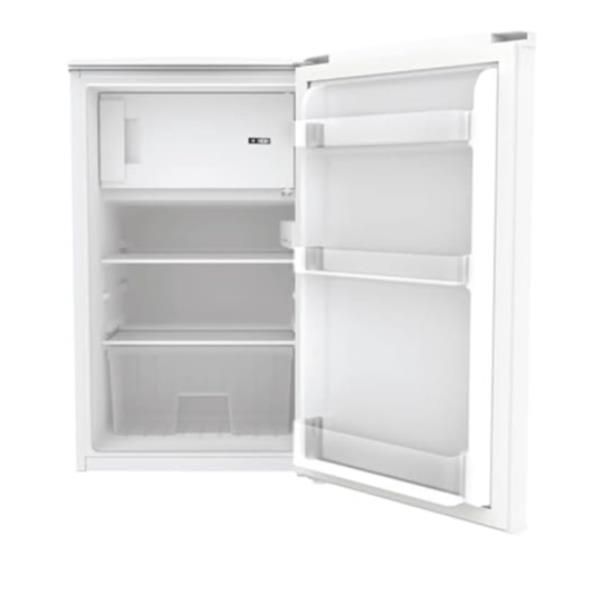 Frigo refrigeratore da tavolo, libera installazione, della Candy. Colore bianco. Frigo con piano da tavolo con anta. Controllo meccanico. Materiale dei ripiani della porta in plastica e mensola porte Fram. LED a luce interna.