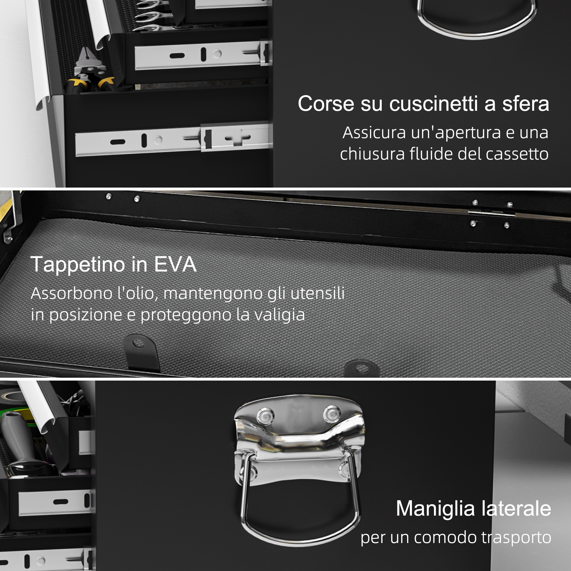 Scopri la comodità di organizzare i tuoi utensili con la cassetta degli attrezzi . Questa cassetta per attrezzi con serratura è dotata di 6 cassetti con guide a sfera per un movimento fluido. Ogni spazio è dotato di tappetini in EVA che proteggono gli utensili e impediscono la formazione di graffi. Il telaio in acciaio verniciato a polvere conferisce un aspetto elegante a questa cassetta degli attrezzi in metallo, completa di maniglie laterali per una facile mobilità.Caratteristiche:• 6 cassetti e un piano superiore per organizzare al meglio i tuoi attrezzi• Guide scorrevoli a sfera per un movimento fluido• Telaio della cassetta degli attrezzi in acciaio con rivestimento a polvere per una lunga durata• Serratura per tenere tutti i cassetti chiusi• Tappetini interni in EVA per assorbire unto e proteggere gli utensili• Maniglie laterali per facilitare il trasporto• Prodotto pronto all’uso, non serve montaggio Dati tecnici:• Colore: Nero e rosso• Materiale: Acciaio• Dimensioni complessive: 60L x 26P x 34A cm• Dimensioni cassetto: 15L x 22P x 3A cm, 50.5L x 22P x 3A cm, 50.5L x 22P x 7.5A cm• Dimensioni ripiano superiore: 59.5L x 25.5P x 6A cm• Capacità di peso: 50 kg (totale), 15 kg (cassetto grande/medio), 5 kg (cassetto piccolo)Contenuto della confezione:• 1 x Cassetta per attrezzi• 2 x Chiavi