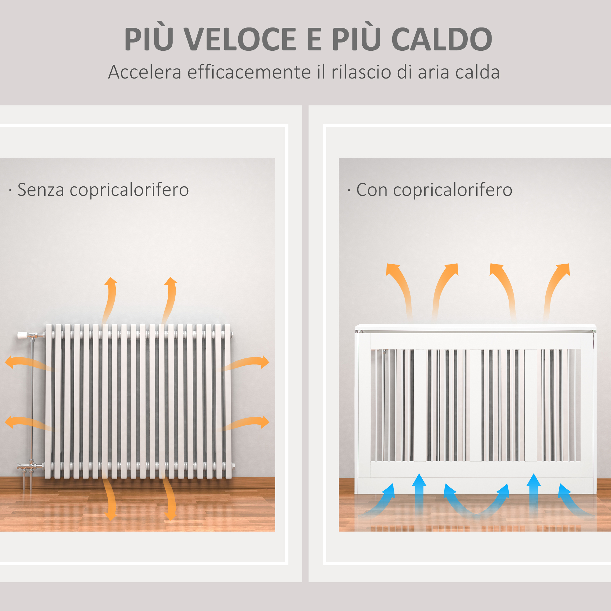 Riorganizza e rendi più elegante la tua stanza con questo copricalorifero . Realizzato con un design elegante e semplice, il prodotto si abbina perfettamente a qualsiasi arredamento. Dotato di doghe sulla parte anteriore per garantire la ventilazione e il flusso di calore, il copritermosifone è rifinito con un ampio piano d’appoggio per foto, piante, ecc. Viene fornito con accessori antiribaltamento per evitare incidenti. Eccellente combinazione di bellezza e funzionalità per la tua casa.Caratteristiche:• Struttura a doghe con prese d’aria per il passaggio del calore• Tiene lontani i bambini e gli animali domestici dal calore• Base d’appoggio per esporre piante, foto ecc• Struttura in MDF e tubi d’acciaio• Raccordi necessari inclusi per una facile installazione a parete• Montaggio richiestoDati tecnici:• Colore: Bianco• Materiale: MDF, Acciaio• Dimensioni complessive: 60L x 18P x 84Acm• Dimensioni interne: 57L x 16.5P x 82.5Acm• Capacità di peso: (ripiano superiore) 5kgContenuto della confezione:• 1 x Copritermosifone• 1 x Manuale di istruzioni