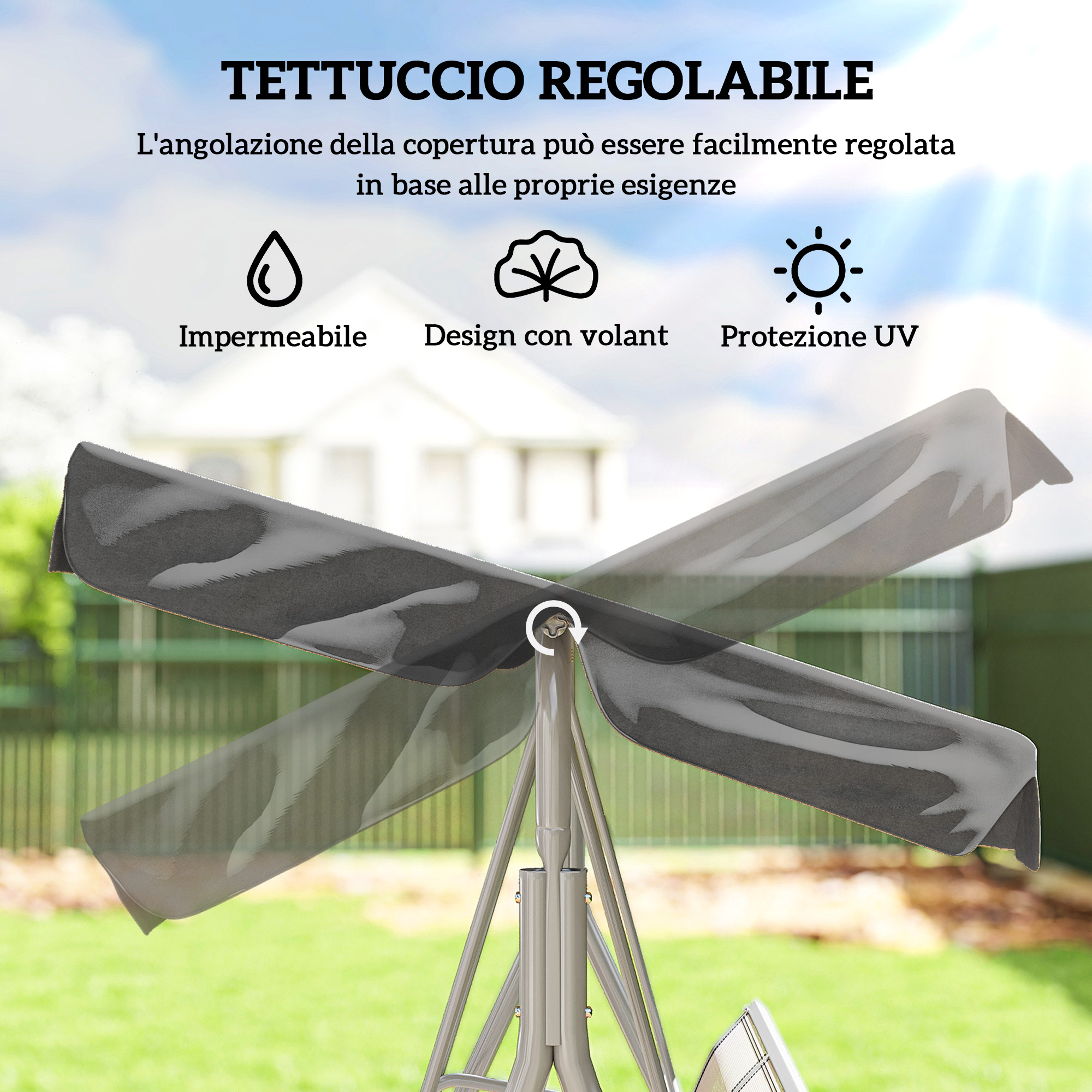 Il dondolo da terrazzo è l’arredo perfetto per godersi il tempo all’aria aperta insieme agli amici o alla famiglia. Realizzato con una solida struttura metallica, questo dondolo da giardino è dotato di una copertura per proteggersi dal sole. Il design minimalista con colori neutri lo rende un’elegante aggiunta al tuo arredamento da esterno.Caratteristiche:• Dondolo da esterno realizzato in metallo resistente alla ruggine e durevole• Massima protezione dal sole con il tetto in poliestere• Sedute del dondolo da giardino realizzate con tessuto traspirante• Adatto per 3 persone e con un carico massimo di 240 kg• Facile manutenzione della struttura e tetto rimovibile e lavabile• Montaggio richiesto Dati tecnici:• Colore: Grigio chiaro, Argento• Materiale: Metallo, Poliestere, Tessuto plastificato• Dimensioni generali: 171L x 108P x 154A cm• Dimensione copertura: 170L x 111P cm• Dimensione seduta: 131L x 47.5P x 42A cm• Capacità di carico: 240 kgContenuto della confezione:• 1 x Dondolo 3 posti• 1 x Manuale