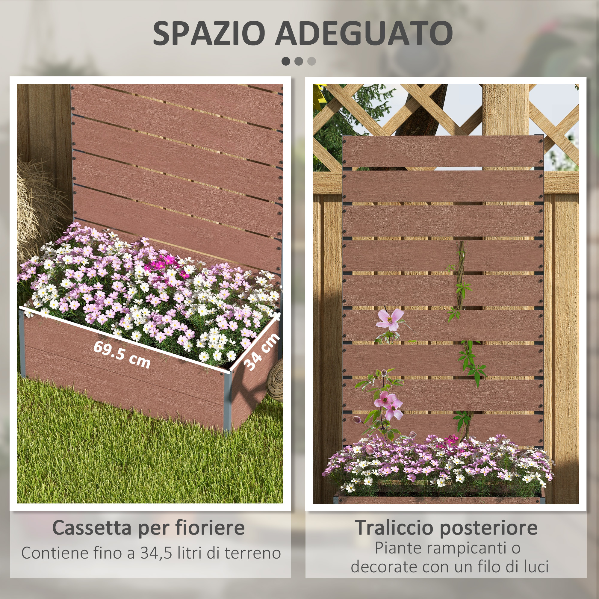 La nostra fioriera da giardino è in grado di portare lo stile dei tuoi ambienti aperti a un nuovo livelli. Questa fioriera per esterno ti permetterà infatti di ospitare bellissime piante, mentre l’arco superiore e il traliccio su entrambi i lati sono adatti per rampicanti e decorazioni varie. Grazie al suo design dalle linee chiare, questa fioriera rialzata si rivela un ottimo complemento d’arredo per ogni giardino.Caratteristiche:• Traliccio posteriore incluso in modo per consentire la crescita a viti e rampicanti• Fioriera da giardino ad altezza regolabile per soddisfare le diverse esigenze delle piante• Il tessuto non tessuto e due fori di drenaggio inferiori favoriscono la salute delle radici e del terreno• Fioriera in legno di abete robusto e stabile con rivestimento protettivo• Design a parete salvaspazio• Montaggio richiestoDati tecnici:• Colore: Legno naturale• Materiale: Legno di abete• Dimensioni complessive: 60L x 16P x 100A cm• Dimensioni dell’area di coltivazione: Grande: 57L x 10P x 10A cm, Piccola: 27L x 10P x 10A cm• Capacità di peso: 18 kg (fioriera grande), 10 kg (fioriere piccole)Contenuto della confezione:• 1 x Fioriera con grigliato• 1 x Set di viti• 1 x Manuale di istruzioni