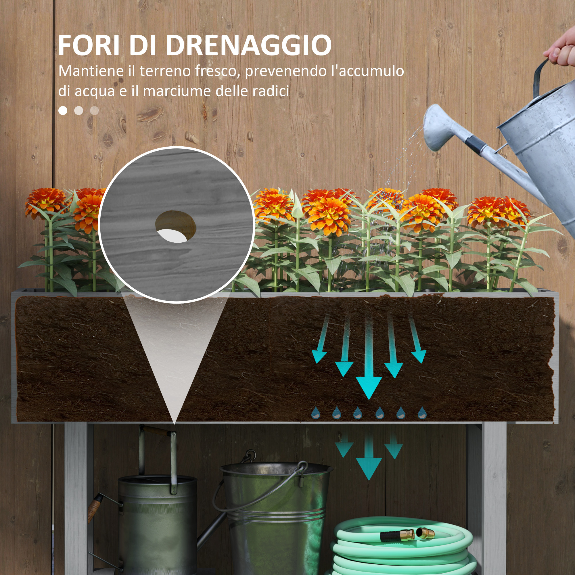Goditi il piacere del giardinaggio con la fioriera in legno . Unisce un’ampia area rialzata per coltivare fiori ed erbe a un traliccio per piante rampicanti. Approfitta della pergola superiore per appendere vasi e decorazione e rendere la fioriera unica e originale. I fori di drenaggio e il rivestimento in tessuto non tessuto mantengono le piante sane e rigogliose. La struttura in legno naturale è resistente a crepe e intemperie, per durare a lungo nel tempo.Caratteristiche:• Il design del letto per orto rialzato e del traliccio supportano diversi tipi di piante• Il tetto a pergola offre spazio per appendere cestini e piante in vaso• I fori di drenaggio eliminano l’acqua in eccesso, mantenendo le radici delle piante sane• Il rivestimento in tessuto non tessuto incluso previene la perdita di terra• La struttura della fioriera in legno naturale garantisce durata e resistenza contro crepe e intemperie• Montaggio richiestoDati tecnici:• Colore: Finitura in legno naturale• Materiale: Legno di abete• Dimensioni complessive: 64L x 33P x 122A cm• Dimensioni area interna: 58L x 24P x 31A cm• Dimensioni del traliccio: 64L x 3P x 91A cm• Capacità di peso: 50 kg (totale), 10 kg (tetto)Contenuto della confezione:• 1 x Letto da giardino rialzato con graticcio• 1 x Manuale​​