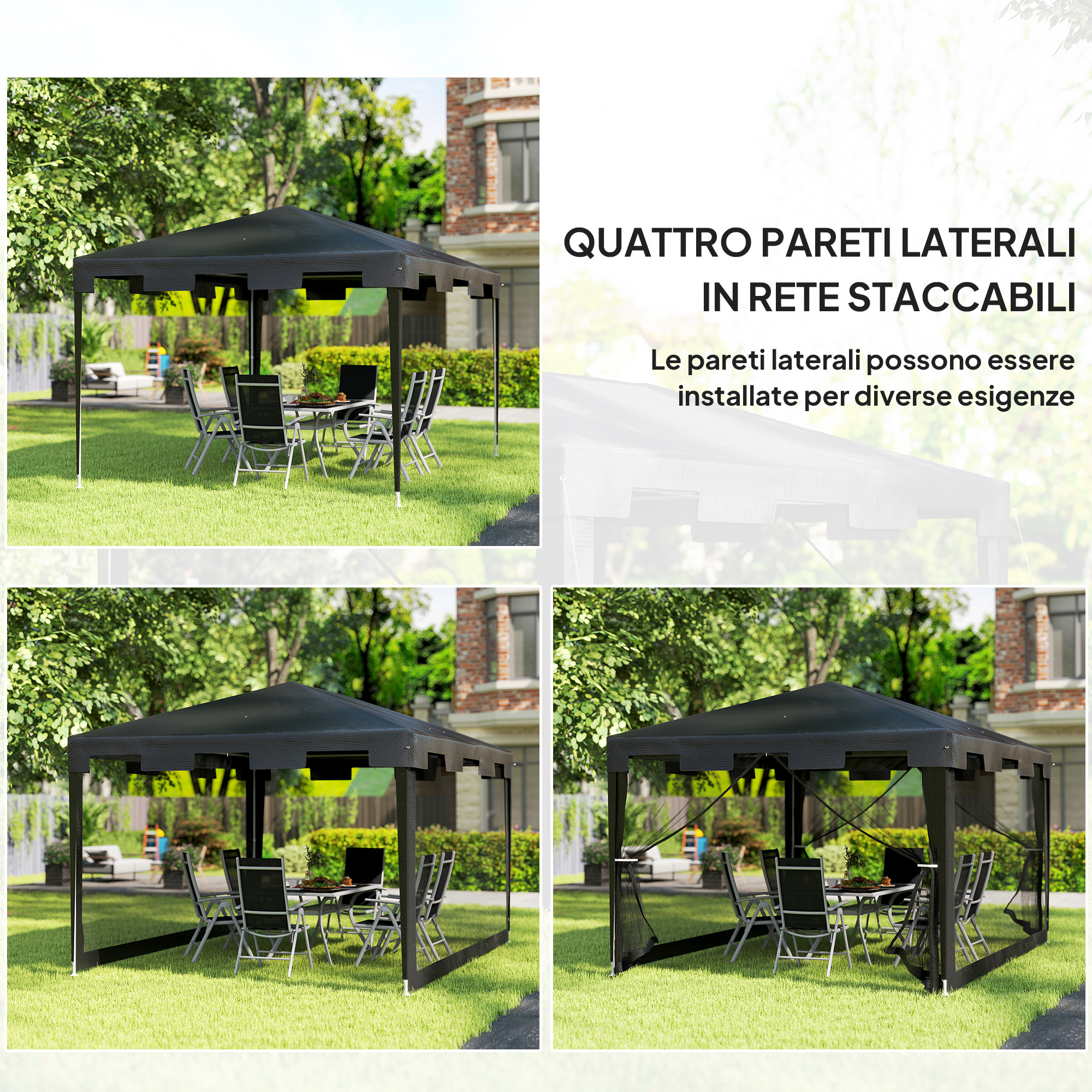 La tenda gazebo è l’alleato ideale per organizzare i tuoi all’aperto durante le belle giornate estive e primaverili. È composto da una struttura in metallo che sostiene la copertura in PE, facile da pulire e resistente, mentre le pareti con zanzariera tengono alla larga gli insetti. Sarai finalmente in grado di rilassarti all’interno del nostro gazebo da giardino per goderti un pranzo o un pisolino su una sdraio.Caratteristiche:• Gazebo in metallo rivestito a polvere resistente alla ruggine e durevole• Gazebo da giardino con tetto in PE resistente al sole• 2 porte con cerniera per entrare e uscire facilmente• 4 pareti con zanzariera incluse• Adatto per eventi o per il giardino di casa• Assieme alla tenda gazebo sono incluse 4 funi e 8 picchettiDati tecnici:• Colore: Bianco, nero• Materiale: Metallo, tessuto PE• Dimensioni complessive: 395L x 295P cm• Altezza di gronda: 200 cm• Altezza superiore: 255 cm• Tubo di rinforzo: Ø16 x 0.38P mmContenuto della confezione:• 1 x Gazebo da giardino• 4 x Funi• 8 x Picchetti• 1 x Manuale di istruzioni