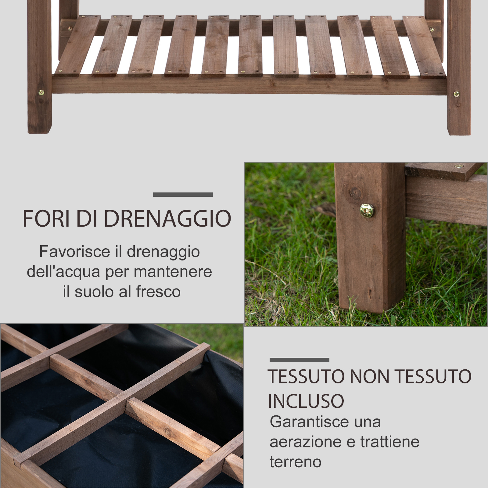 Questa fioriera rialzata di dall’aspetto semplice e rustico e offre il massimo della praticità nel giardinaggio. La struttura in legno di abete è stabile e durevole, adatta per l’uso all’esterno, mentre la presenza di un ripiano laterale pieghevole e 8 sezioni separate offre tanto spazio per coltivare al meglio le tue piante. Inoltre, la fioriera è dotata di un pratico ripiano inferiore dove puoi riporre i tuoi attrezzi da giardino.Caratteristiche:• Aiuola rialzata che ti consente di prenderti cura delle piante rimanendo in piedi• Fioriera da esterno ideale da inserire in spazi come patio, balcone, giardino e non solo• Fioriera in legno di abete che rende il letto per orto stabile e durevole• Fioriera rialzata con 8 sezioni separate per coltivare in modo ordinato diversi tipi di piante• Mensola laterale pieghevole e ripiano inferiore per riporre ogni tuo oggetto• 4 fori di drenaggio per evitare l’accumulo d’acqua• Montaggio richiesto Dati tecnici:• Colore: Caffè Scuro• Materiale: Legno di abete• Dimensioni complessive: 123L x 54P x 87A cm• Dimensioni dello spazio interno della fioriera: 95.5L x 48P x 21A cm• Dimensioni della mensola a doghe: 92L x 45.5P x 20A cm• Dimensioni della mensola: 48L x 20P cm• Capacità di peso: 100 kg (fioriera), 40 kg (ripiano inferiore a doghe)Contenuto della confezione:• 1 x Letto per orto rialzato• 1 x Manuale di montaggio​​