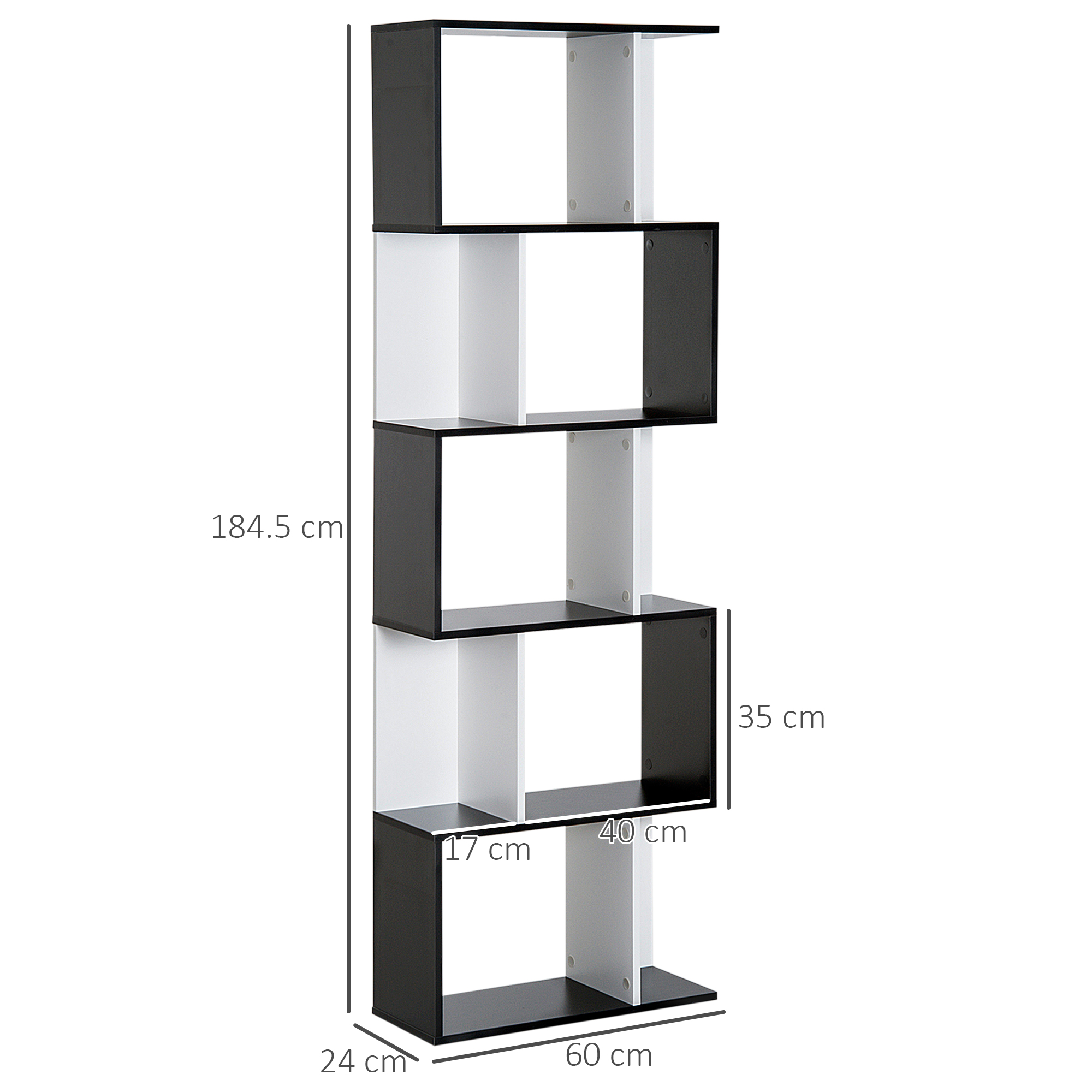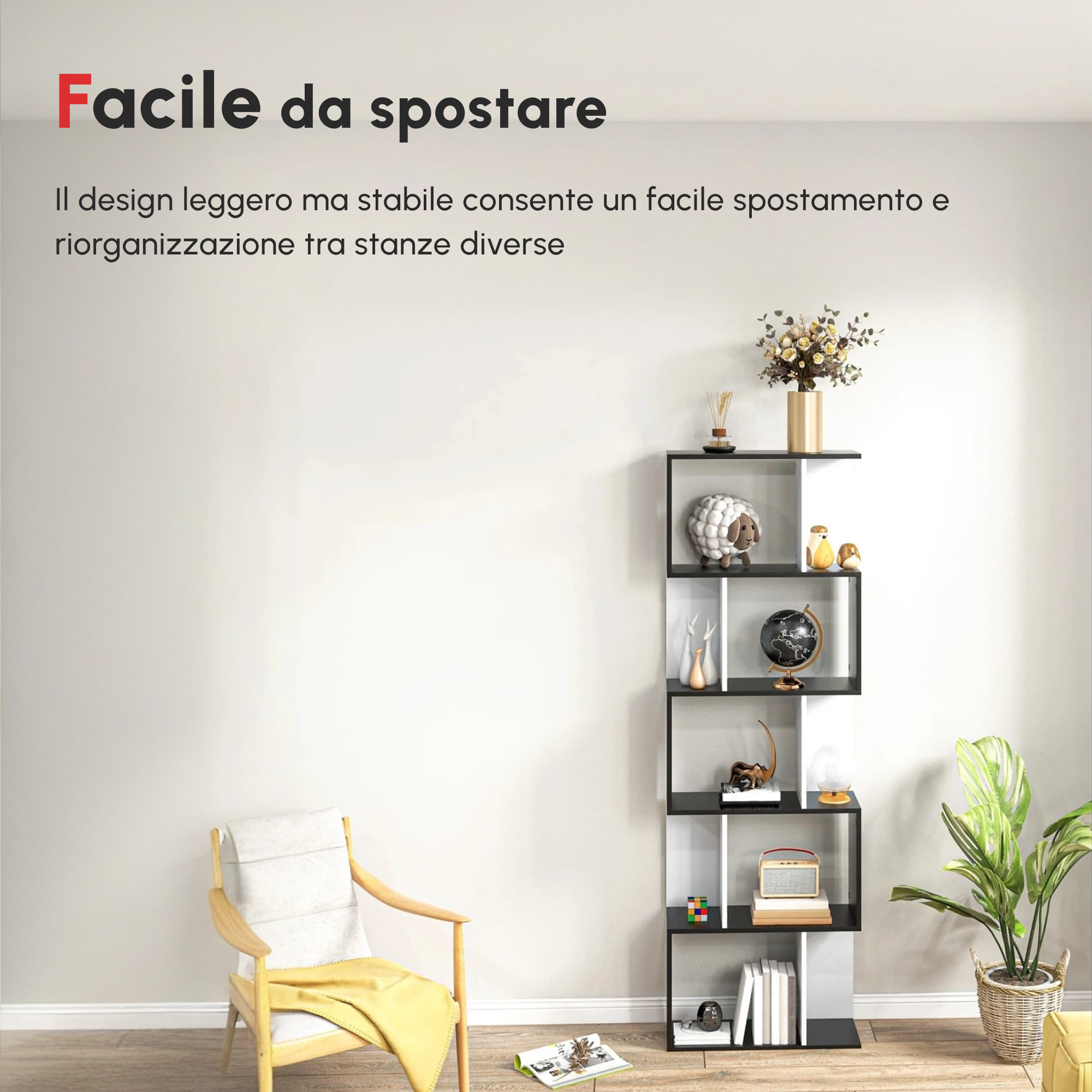 Mobile Libreria in Legno a 5 Ripiani con Divisorio, 60x24x184.5 cm, Bianco e Nero