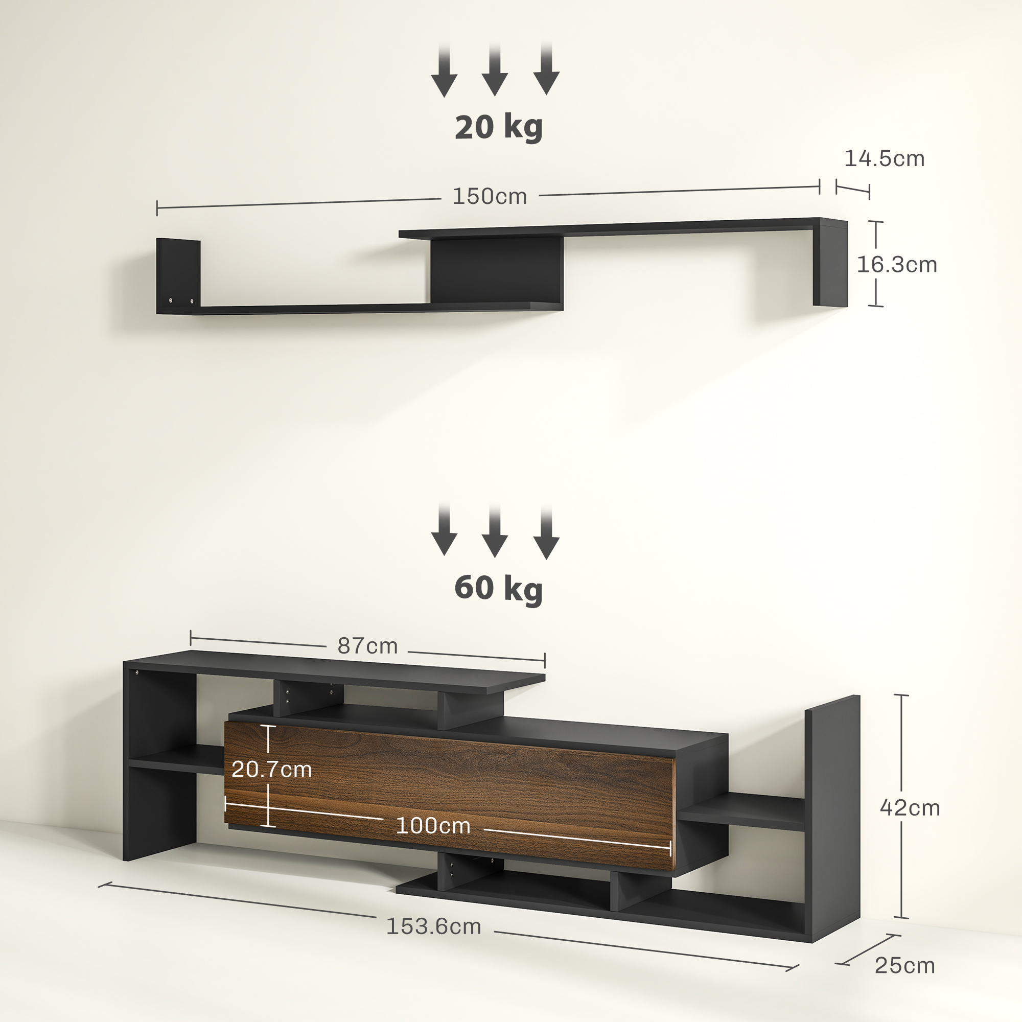 Invita i tuoi amici a guardare un film davanti al nostro mobile TV . Questo mobile porta TV moderno stupirà gli ospiti per la sua eleganza e per come si inserirà bene nell’arredamento. I ripiani aperti e l’armadietto con anta offrono un ampio spazio per i tuoi oggetti. Inoltre, la mensola sospesa può aiutarti a massimizzare l’uso dello spazio a parete. Scegli un complemento elegante e naturale per il tuo salotto di casa con questo mobile TV sospeso!Caratteristiche:• La finitura liscia e la forma geometrica conferiscono al mobile TV un tocco di eleganza• Ripiani aperti e armadietto chiuso che offrono tanto spazio per tenere tutto in ordine• Mensola aggiuntiva da fissare alla parete per esporre i propri oggetti• Mobile porta TV realizzato con pannelli di truciolato molto stabili• Montaggio richiestoDati tecnici:• Colore: Bianco e nero• Materiale: Pannello di truciolato• Dimensioni complessive: 153.6L x 25P x 42A cm (supporto TV), 150L x 14.5P x 16.3A cm (ripiano a parete)• Dimensioni piano d’appoggio: 87L x 25P cm• Spazio a sinistra mensola: 88.5L x 13P x 13.3A cm• Dimensioni interne armadietto: 97.5L x 23.5P x 18A cm• Capacità di peso: 60 kg (mobile TV), 20 kg (mensola a muro)Contenuto della confezione:• 1 x Mobile TV• 1 x Mensola a muro• 1 x Istruzioni​​