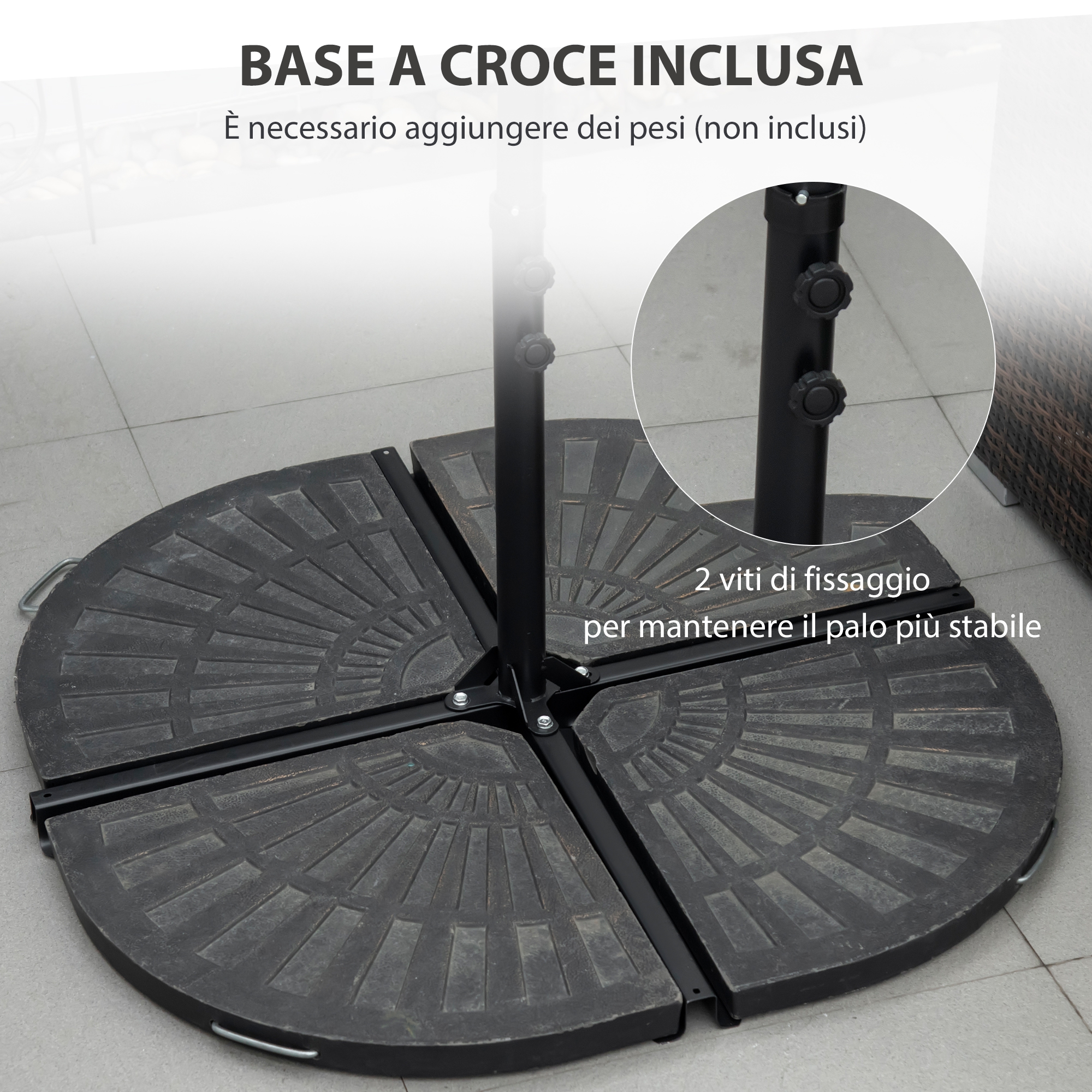 Quest’estate, utilizza il nostro ombrellone da giardino per tenere all’ombra il tuo divano da esterno, le sedie e altro ancora. Di’ addio alle scottature estive con questo ombrellone regolabile e girevole a 360° per proteggerti dal sole a ogni angolazione. Apri e chiudi l’ombrellone facilmente con la manovella integrata, per goderti ogni momento all’aria aperta con il massimo comfort.Caratteristiche:• Ombrellone a sbalzo per fare ombra nei tuo spazi esterni e proteggerti dal sole• Tettuccio ventilato che rende l’ombrellone a braccio stabile contro il vento• Rotazione di 360° per restare al riparo dal sole in ogni momento• Realizzato in tessuto di poliestere e telaio in acciaio stabile• Supporto con due viti di fissaggio• Ombrellone a manovella per una rapida apertura e chiusura• Laccio di sicurezza per tenere chiuso l’ombrellone quando non è in uso Dati tecnici:• Colore: Grigio Scuro• Materiale: Poliestere, acciaio• Diametro dell’ombrellone: Ø256 cm• Altezza ombrellone: 245 cm• Altezza base del tettuccio: 200 cm• Dimensioni base: 100L x 100P x 5A cm• NOTA 1: Il peso richiesto di 60 kg non è incluso• NOTA 2: Non utilizzare l’ombrellone in caso di condizioni atmosferiche estreme (vento forte, pioggia battente, neve)Contenuto della confezione:• 1 x Ombrellone da giardino a braccio• 1 x Kit di accessori• 1 x Manuale