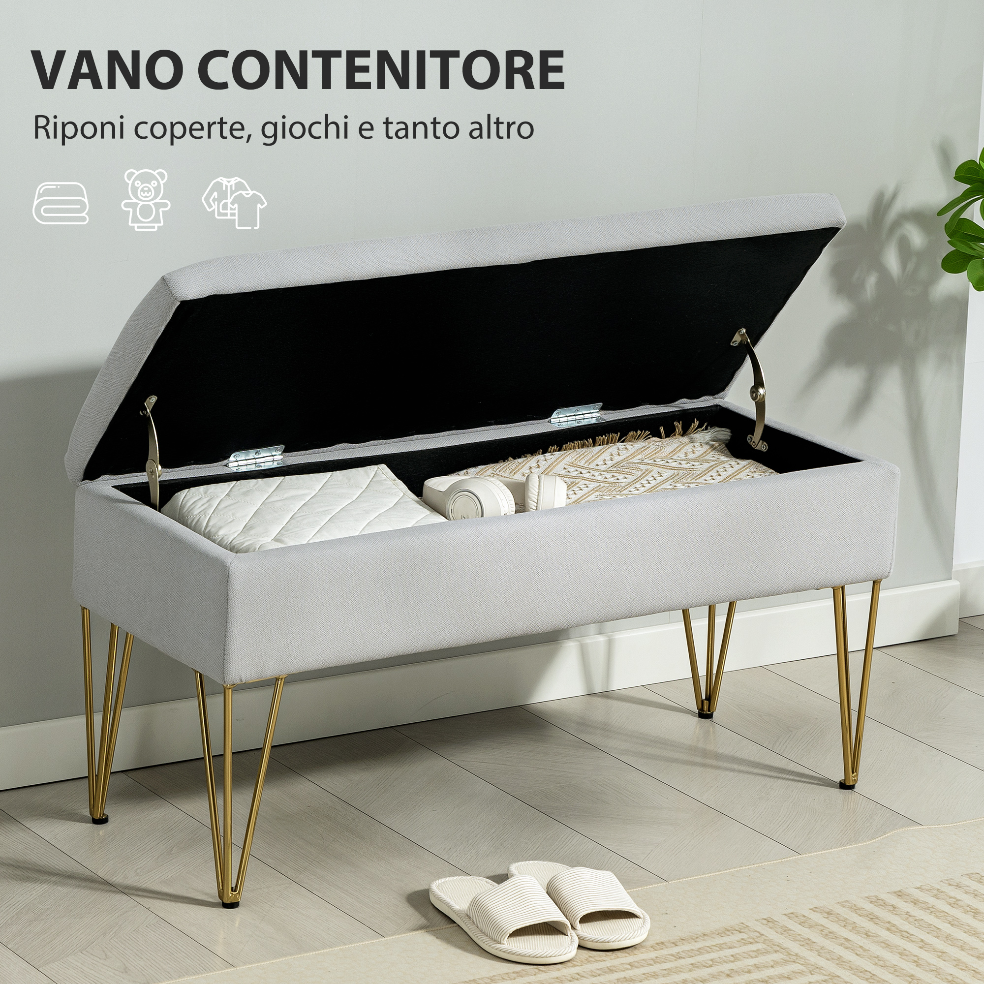 Recensisci per primo “Panca Fondo Letto con Contenitore in Tessuto e Gambe in Acciaio, 100x40x49 cm, Grigio Chiaro”