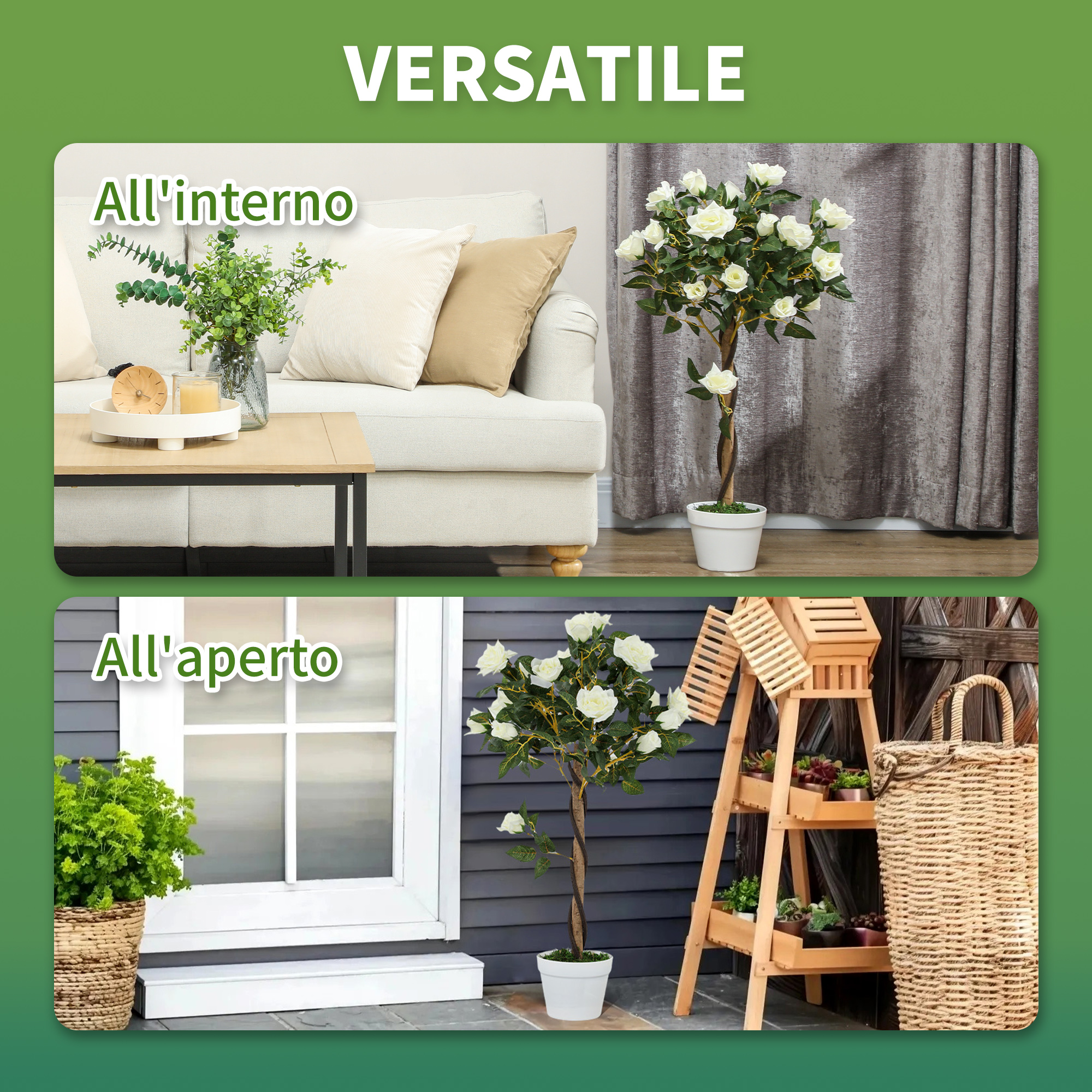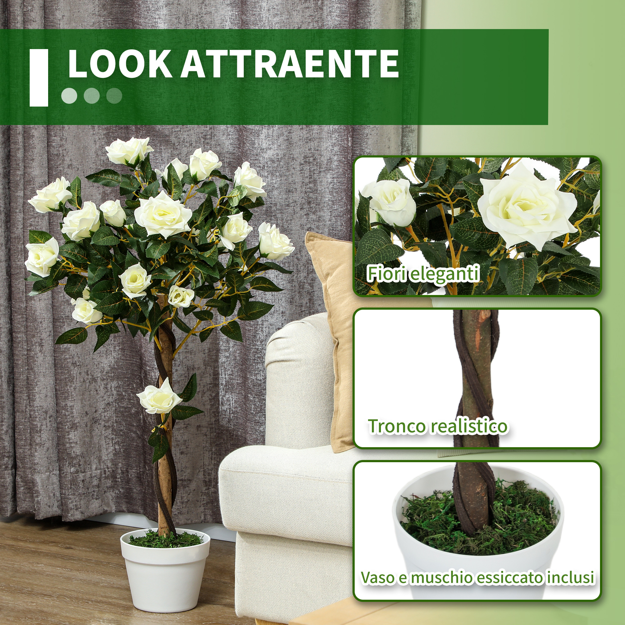 Rimpiangi di non aver mai imparato a prenderti cura delle piante? Non rinunciare a portare il verde in casa tua grazie alla pianta finta di rosa bianca ! Non hai bisogno di utensili per il giardinaggio, la rosa sarà sempre fiorita e verde. Porta un tocco di eleganza in casa o in giardino con questo alberello di rosa.Caratteristiche:• Pianta finta dal design realistico ed elegante• Per uso interno ed esterno, ideale per la casa, l’ufficio o il giardino• Pianta da arredo composta da 350 foglie e 21 fiori• Solido vaso incluso con rinforzo• Finto muschio in PE e base cementata incorporata per una maggiore stabilità• Facile da mantenere e pulire Dati tecnici:• Colore: Bianco, Verde• Materiale: PE, PP, Cemento, Tessuto• Dimensioni generali: Ø18 x 90A cm• Dimensioni vaso: Ø18 x 14A cmContenuto della confezione:• 1 x Pianta finta di rosa• 1 x Manuale