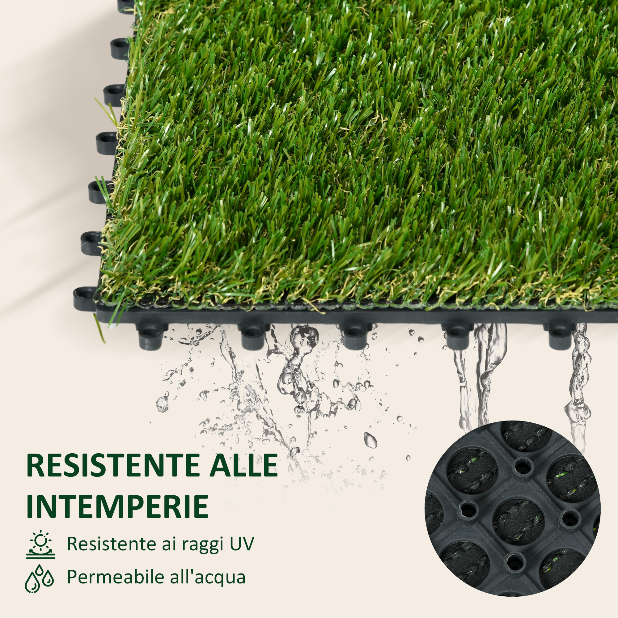Mantieni i tuoi esterni sempre verdi con le piastrelle da giardino con erba finta. Il set è composto da 10 pezzi, con prato finto realistico, morbido e resistente. Realizzate in PP e PE resistenti ai raggi UV, queste piastrelle per esterni sono perfette come alternativa a un prato vero e richiedono pochissima manutenzione. Il fondo traforato assicura il drenaggio dell’acqua e non dovrai mai preoccuparti di tagliare l’erbaCaratteristiche:• Set di 10 mattonelle di prato artificiale, perfetto come alternativa a un vero prato• L’erba finta resta sempre verde ed è resistente ai raggi UV• Piastrelle da giardino realizzate in PP e PE, morbidi e ignifughi• Mattonelle resistenti all’uso e durevoli• Fondo traforato con funzione di drenaggio dell’acqua• Facile da mantenere• Montaggio richiesto Dati tecnici:• Colore: Verde scuro• Materiale: PE, PP• Dimensione geneale: 30L × 30P × 3.5A cm• Altezza erba: 25 mm• Carico massimo: 400Kg/m²• Densità: 6500Contenuto della confezione:• Set 10 pezzi mattonelle di prato sintetico;