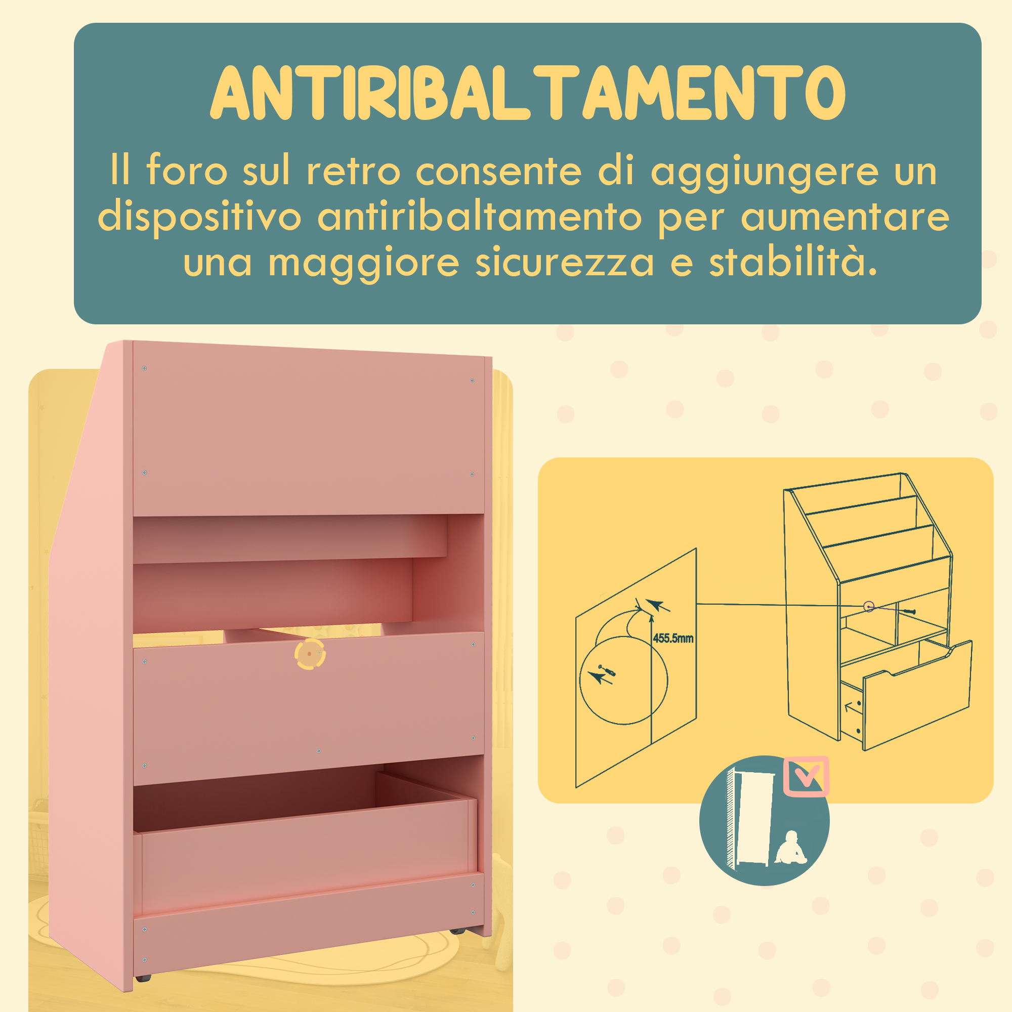 Piccola Libreria per Bambini con Ripiani e Cassetto in MDF, 60×29.9x90cm, Rosa