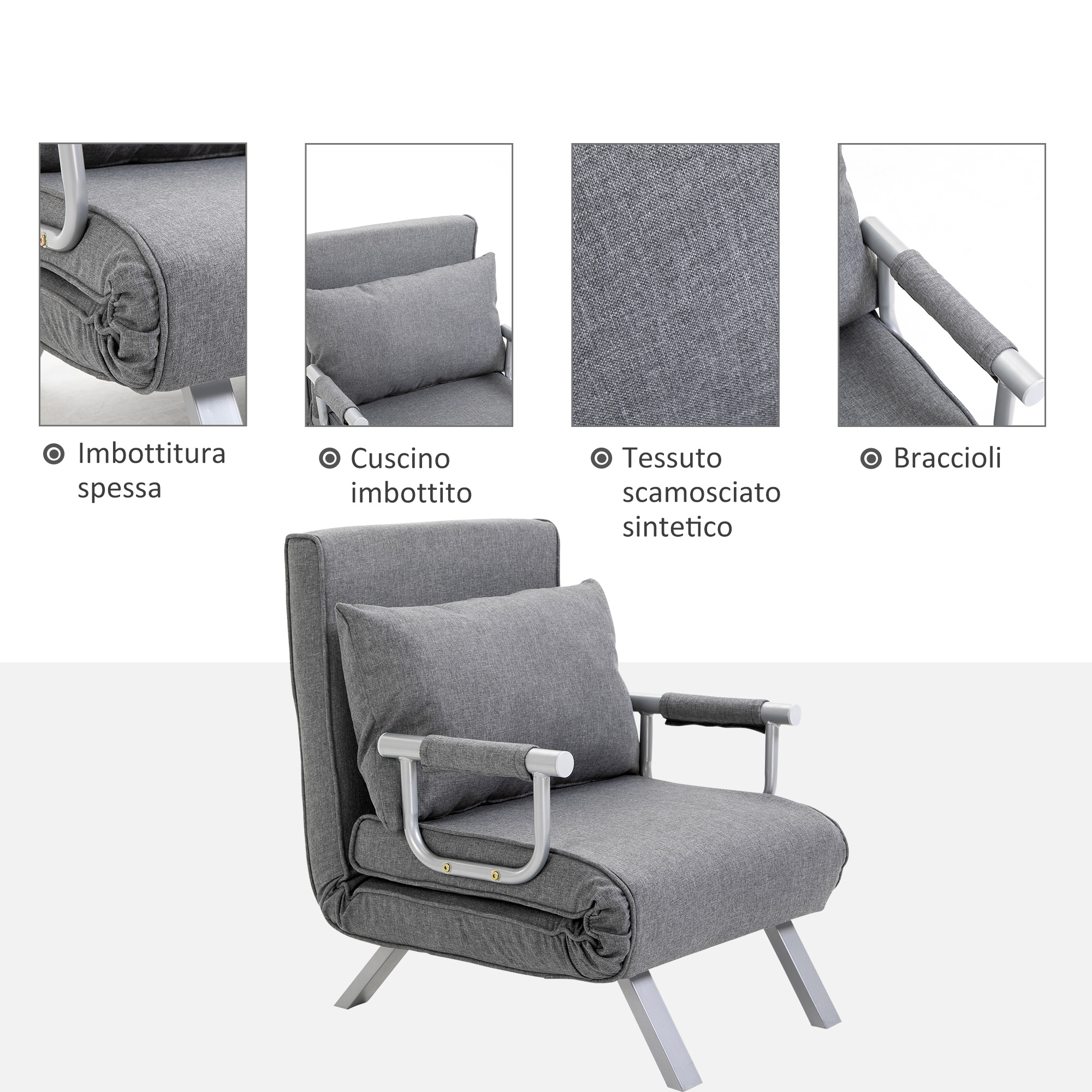Poltrona Letto con Schienale Regolabile su 5 Livelli e Cuscino imbottitura, in Tessuto e in metallo, 65x69x80cm, Grigio Chiaro § Italy