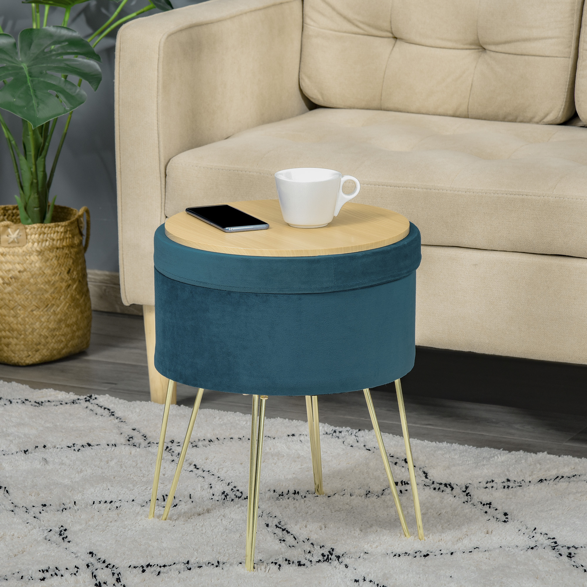 Pouf Contenitore 2 in 1 Uso Sgabello o Tavolino in Legno e Velluto Verde