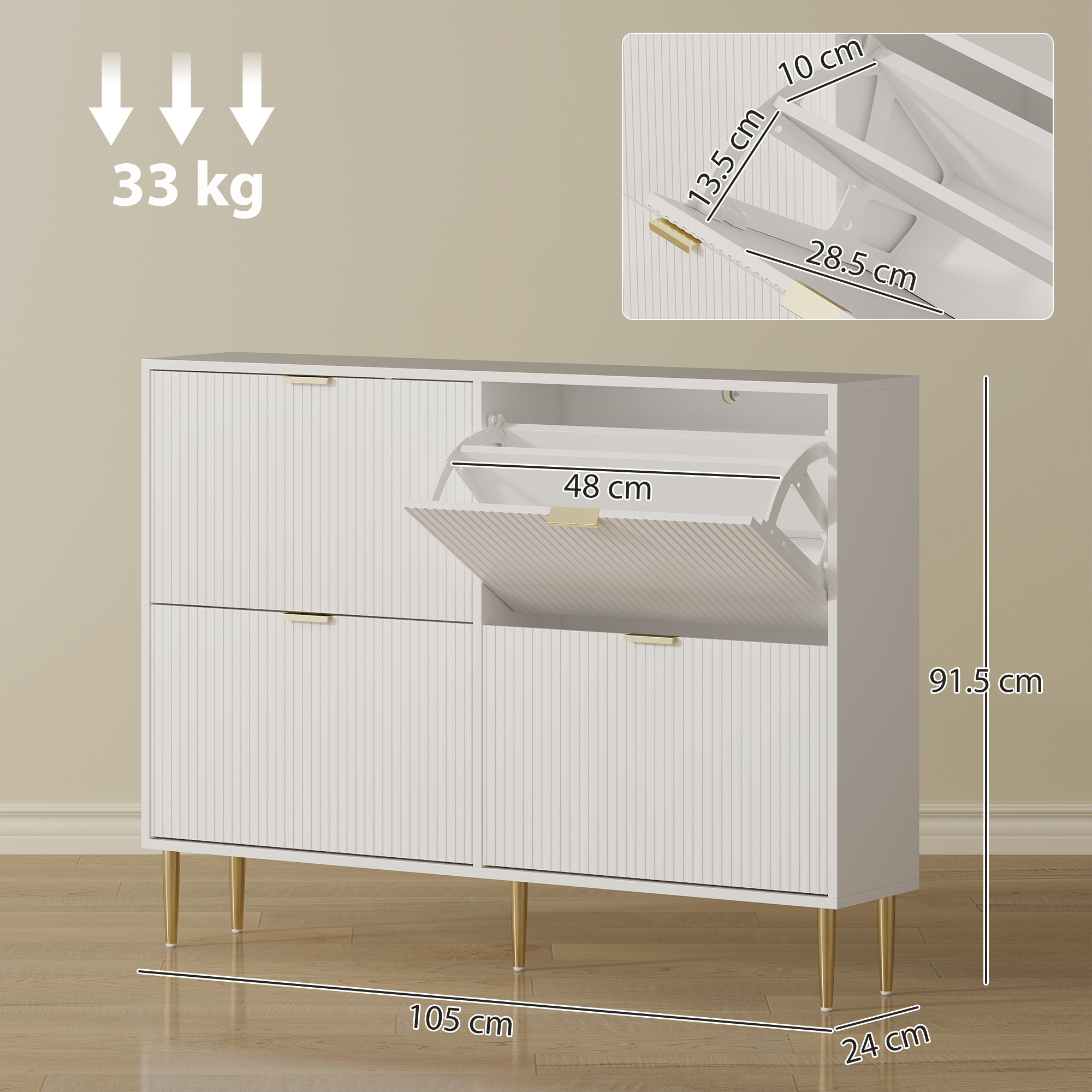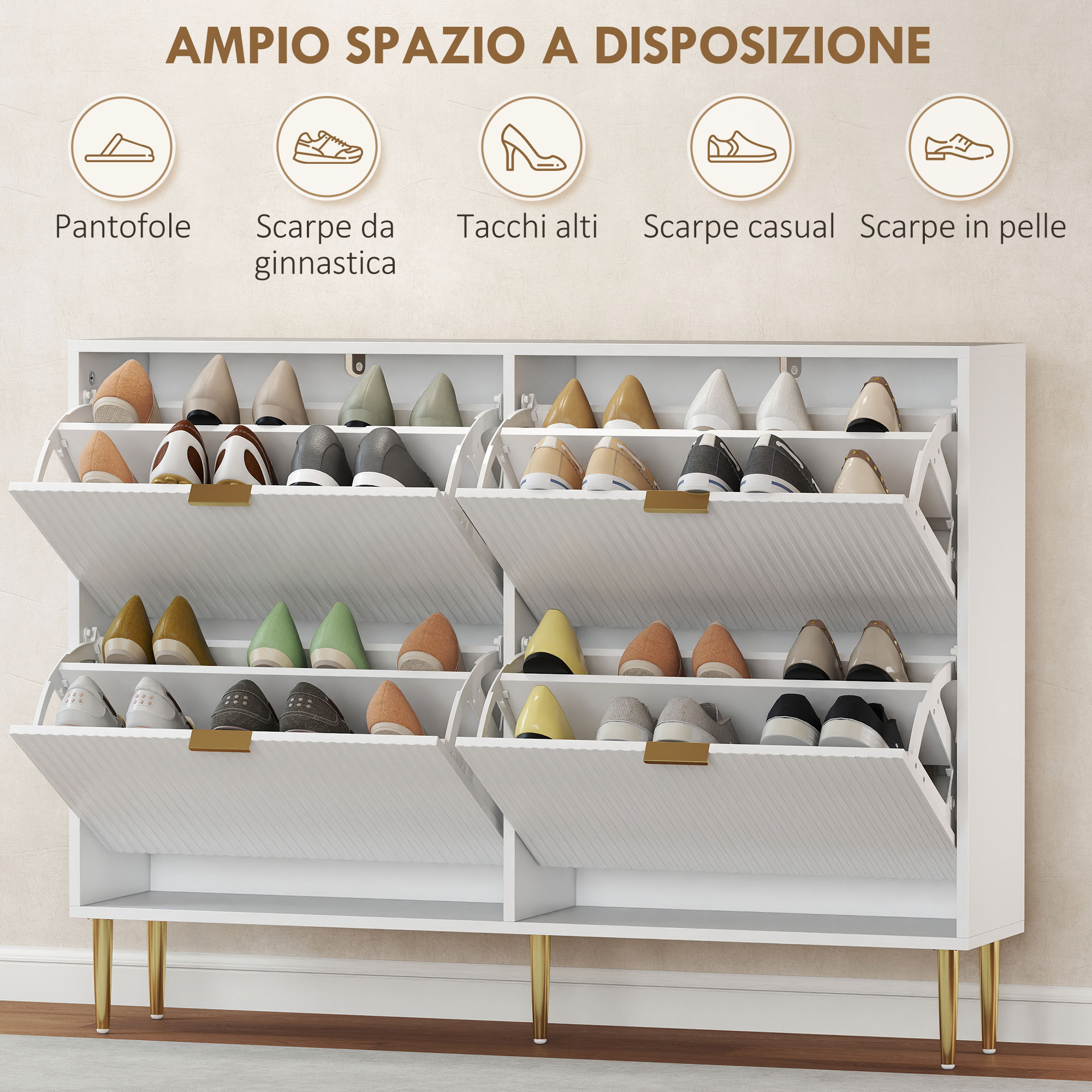 Ne hai abbastanza di inciampare nelle scarpe all’ingresso? Il mobile scarpiera , con design boho chic in rattan e piano effetto quercia, porta un tocco di calore ai tuoi spazi. Organizza facilmente fino a 14 paia di scarpe nei suoi cassetti a ribalta, perfetti per trovarle facilmente quando devi uscire. Grazie al suo design compatto, questa scarpiera slim si inserisce bene anche in spazi stretti, tenendo l’ingresso sgombro e facile da pulire.Caratteristiche:• Le ante in rattan naturale con piano effetto quercia aggiungono un fascino bohémien alla scarpiera da ingresso• Due cassetti ribaltabili possono contenere fino a 14 paia di scarpe• Ripiani regolabili su due livelli adatti per stivali, tacchi o sneakers• Scarpiera slim dal design sottile consente di risparmiare spazio sul pavimento negli ingressi• Il kit anti-ribaltamento e la robusta struttura in truciolato garantiscono la sicurezza della famiglia• La superficie superiore del mobile porta scarpe può ospitare chiavi, piante o oggetti decorativi• Montaggio necessarioDati tecnici:• Colore: Bianco, rovere• Materiale: Truciolare• Dimensioni complessive: 80L x 24P x 95.5A cm• Dimensioni del piano: 80L x 24P cm• Dimensioni interne cassetto: 65L x 26P x 31A cm (ciascuno)• Altezza base da terra: 13 cm• Capacità di scarpe: 14 paia (fino alla taglia EU 43)• Capacità di peso: 30 kg (totale), 10 kg (piano/cassetto)Contenuto della confezione:• 1 x Mobile porta scarpe• 1 x Manuale