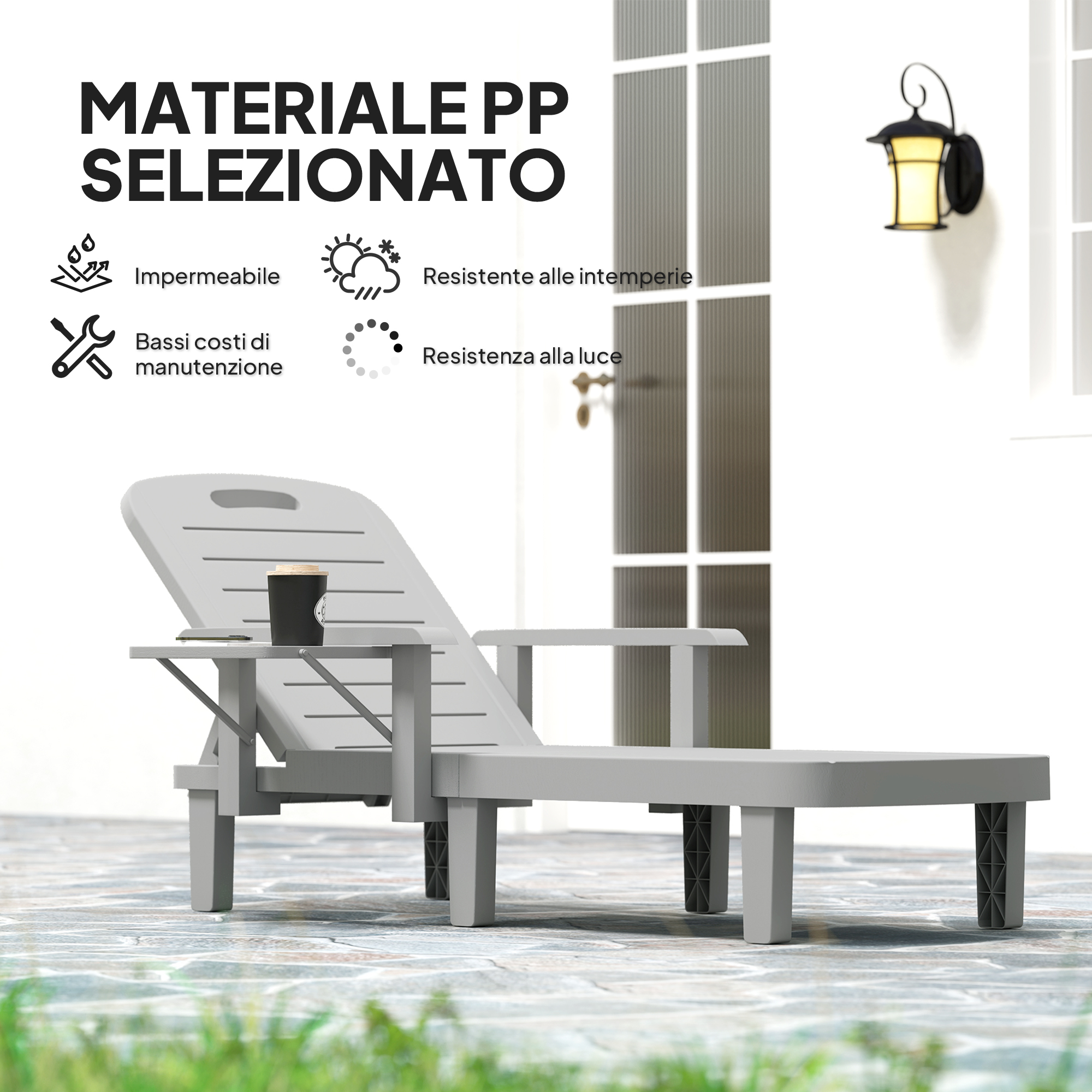 Porta il relax all’aperto da goderti in compagnia con il set di lettini sdraio ! Le 5 posizioni regolabili ti permettono di passare facilmente da 32 a 88 cm di altezza per trovare la tua angolazione preferite. I braccioli ergonomici e il tavolino pieghevole aggiungono praticità alla struttura, mentre il Polipropilene con cui il set si compone si rivela resistente al tempo è perfetta per il giardino o per prendere il sole.Caratteristiche:• Set di sdraio da giardino a 5 posizioni reclinabili per regolare lo schienale• Montaggio richiesto• Il tavolino laterale della sdraio mantiene snack e bevande a portata di mano• Struttura in polipropilene impermeabile per resistere agli elementi esterni• La superficie effetto legno delle sdraio da giardino valorizza il tuo arredo esterno• Montaggio richiestoDati tecnici:• Colore: Grigio Scuro• Materiale: Polipropilene• Dimensioni complessive: 79L x 158P x 88A cm• Dimensioni distese: 79L x 188P x 29A cm• Dimensioni del tavolino: 39L x 18P cm• Altezza da terra: 41 cm• Dimensioni della seduta: 62L x 120P cm• Altezza della seduta (senza cuscino): 29 cm• Dimensioni dello schienale: 67L x 62P cm• Altezza dello schienale da terra: 32/45/62/76/88 cm• Dimensioni del bracciolo: 8L x 63P cm• Altezza del bracciolo da terra: 45 cm• Capacità di peso: 120 kgContenuto della confezione:• 2 x Sdraio da giardino• 1 x Manuale di istruzioni