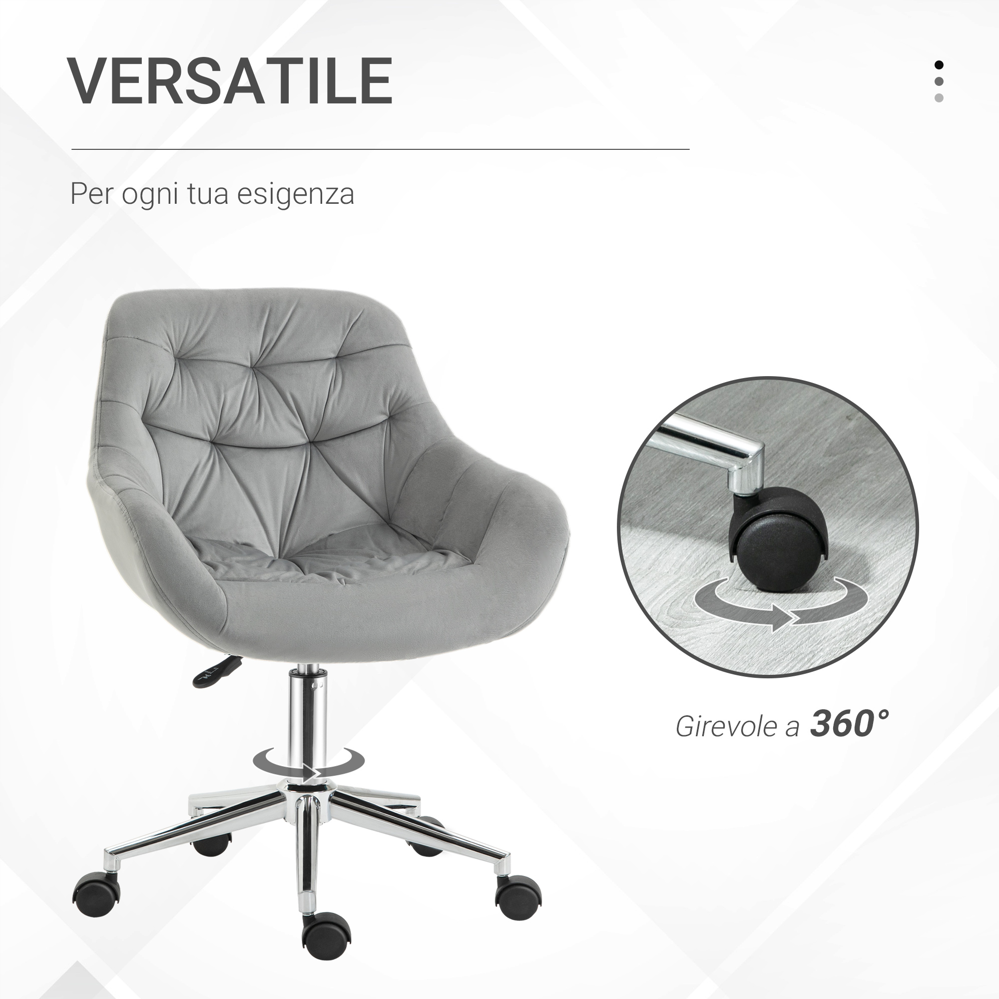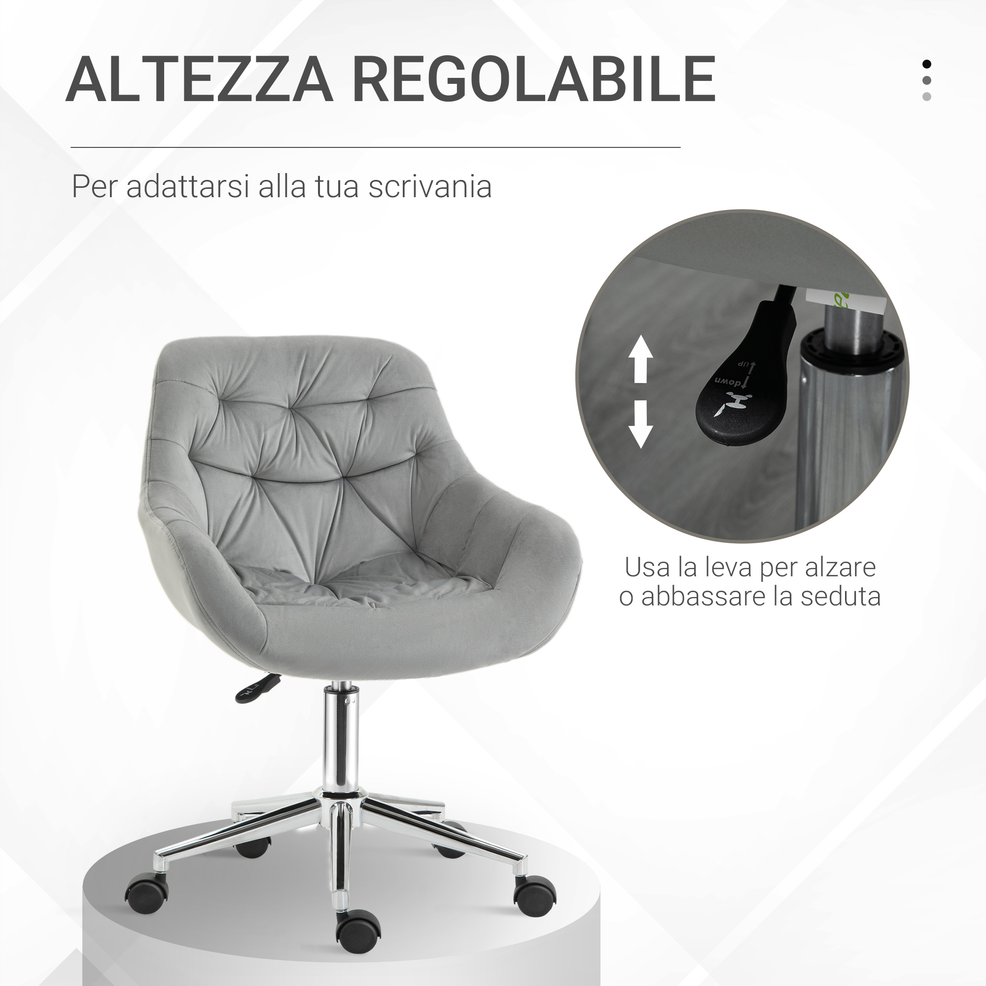 Sedia da Ufficio Ergonomica Girevole con Altezza Regolabile e Ruote, Rivestimento in Velluto, 59x58x80-90cm, Grigio