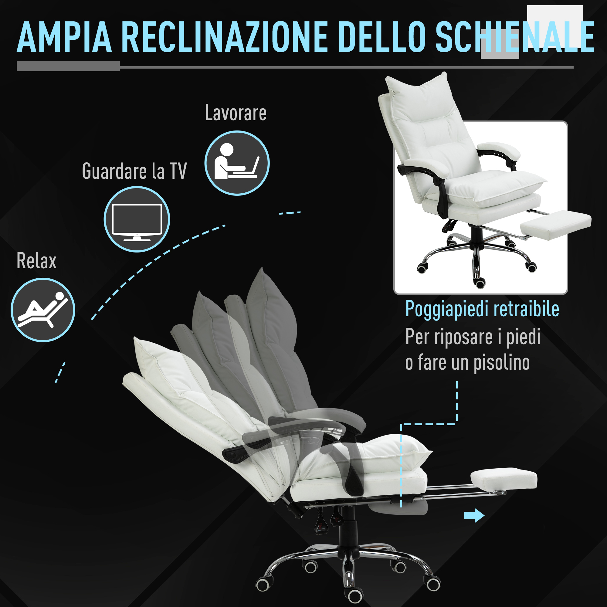 Quando lo stress del lavoro alla scrivania si fa sentire, prenditi una pausa relax con la nostra poltrona da ufficio . Dotata di schienale reclinabile, poggiapiedi estraibile e 7 punti massaggio, ti consente di sciogliere le tensioni e rilassarti direttamente in ufficio. Grazie alla sua morbida imbottitura e al cuscino lombare integrato, questa sedia massaggiante assicura una comodità e un sostegno perfetto per tutta la giornata.?Consigli: Pulire periodicamente con delicatezza per evitare danni da agenti chimici.Caratteristiche:• Poltrona da ufficio con 7 punti massaggianti totali su schienale e seduta• Telecomando incluso e tasca per riporlo• Schienale della poltrona massaggiante reclinabile fino a 155° per sdraiarsi comodamente• Altezza della seduta regolabile per adattarsi a ogni esigenza• Sedia girevole a 360° con 5 rotelle per una libertà di movimento ottimale• Seduta ergonomica, schienale, poggiapiedi e braccioli imbottiti con schiuma ad alta densità• Poggiapiedi retrattile e cuscino lombare integrato• Rivestimento sintetico facile da mantenere• Manuale di montaggio illustrato Dati tecnici:• Colore: Nero• Materiale: Pelle PU, acciaio, schiuma• Dimensioni complessive: 67L x 79P x 111-121A cm• Dimensioni reclinate: 67L x 106P x 99A cm• Dimensioni schienale: 51.5L x 11P x 75.5A cm• Dimensioni seduta: 54L x 53P x 46-56A cm• Dimensioni bracciolo: 8.5L x 50P x 69-79A cm• Capacità di peso: 120 kg• Input: 100-240V/60Hz• Output: 12V/0.6A, 7.2WContenuto della confezione:• 1 x Poltrona da ufficio massaggiante• 1 x Manuale di istruzioni