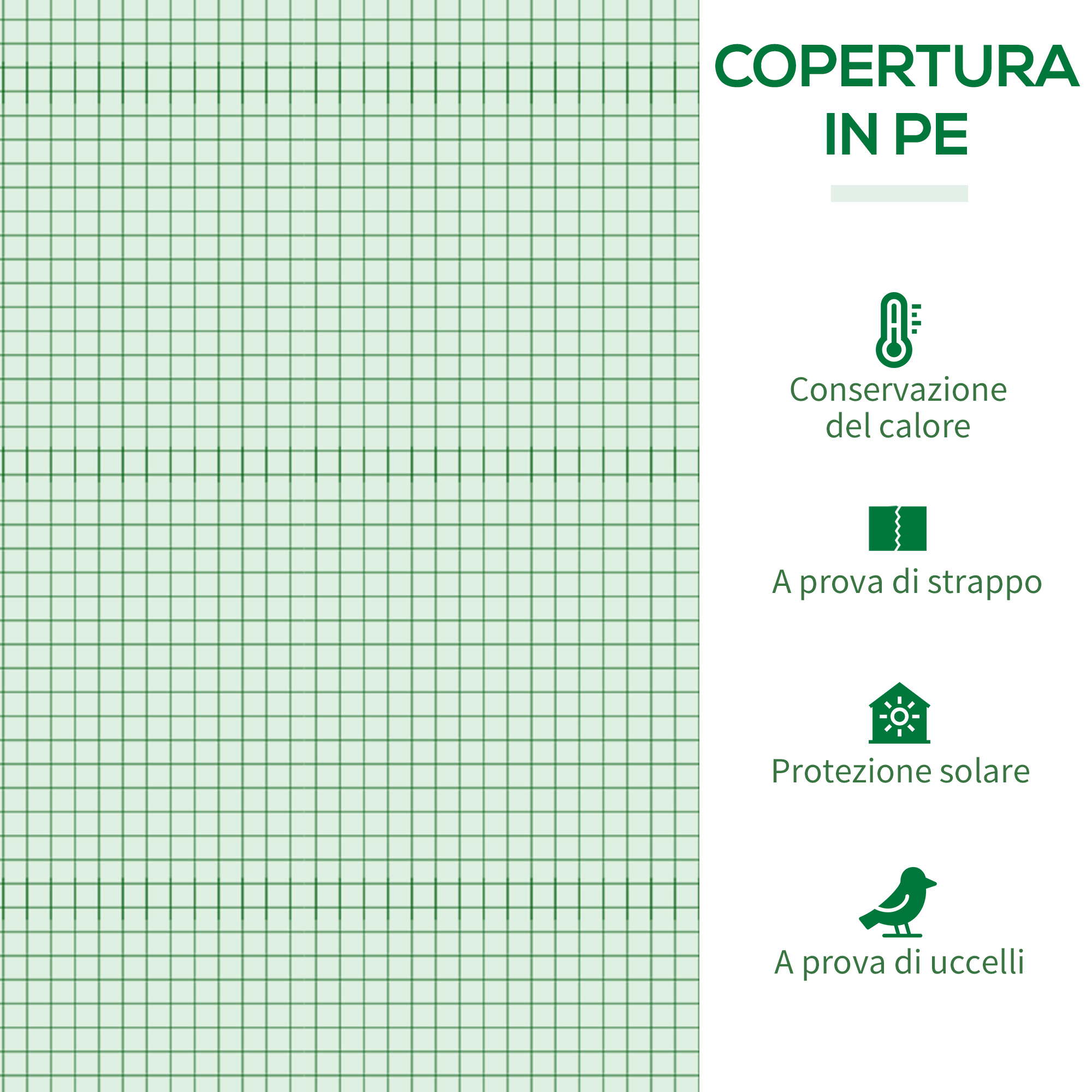 Coltiva le tue piante tutto l’anno con questa serra da giardino . Realizzata con un solido telaio in acciaio e rivestimento in PE rinforzato, protegge le piante dalle intemperie e mantiene l’umidità, per creare l’ambiente perfetto per ogni tipo di pianta. Le 2 finestre avvolgibili consentono un accesso facile allo spazio interno e le finestre a rete facilitano la ventilazione.Caratteristiche:• Solida struttura in acciaio con rivestimento a polvere, durevole e stabile• Copertura in PE spesso e rinforzato• Finestre avvolgibili per un facile ingresso• Finestre avvolgibili un passaggio dell’aria ottimale• Include picchetti a terra per una maggiore stabilità• Montaggio richiesto Dati tecnici:• Colore: Verde• Materiale: Acciaio, PE• Dimensioni generali: 180L x 140P x 80A cm• Dimensioni finestre superiore: 110L x 72A cm• Dimensioni finestra piccola: 38L x 39A cmContenuto della confezione:• 1 x Serra da giardino​​