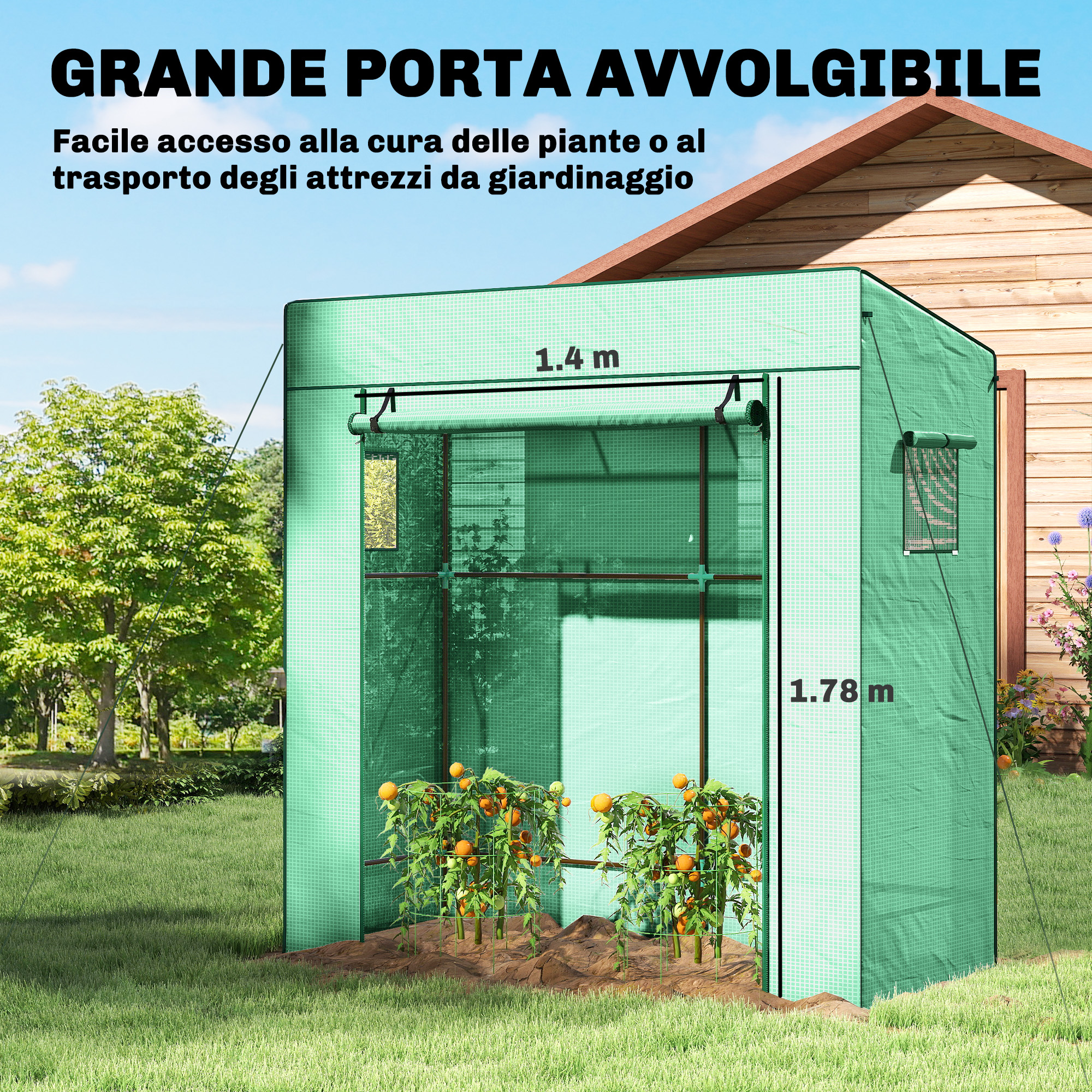 Coltiva diverse piante e ortaggi nei tuoi spazi e libera il tuo pollice verde nella nostra serra da giardino . La sua copertura in plastica protegge efficacemente l’interno dal sole intenso e dalle intemperie, mentre la porta con zip e le 2 finestre offrono una ventilazione ottimale e un ingresso facilitato.Caratteristiche:• La copertura della serra protegge le piante all’interno dagli agenti atmosferici esterni• Serra da giardino con porta avvolgibile con cerniera per un facile accesso e 2 finestre in rete per favorire la ventilazione• Bordi della copertura allungati da interrare nel terreno• Corde di fissaggio e picchetti inclusi per assicurare la serra per piante al suolo• Facile da montare Dati tecnici:• Colore: Bianco• Materiale: Polietilene, acciaio• Dimensioni complessive: 196L x 77P x 197/178A cm• Dimensioni della porta: 140L x 178A cm• Dimensioni della finestra: 32.5L x 32.5A cm• Larghezza bordo: 10 cmContenuto della confezione:• 1 x Serra da giardino• 4 x Corde di fissaggio• 4 x Picchetti da terra• 1 x Manuale di montaggio