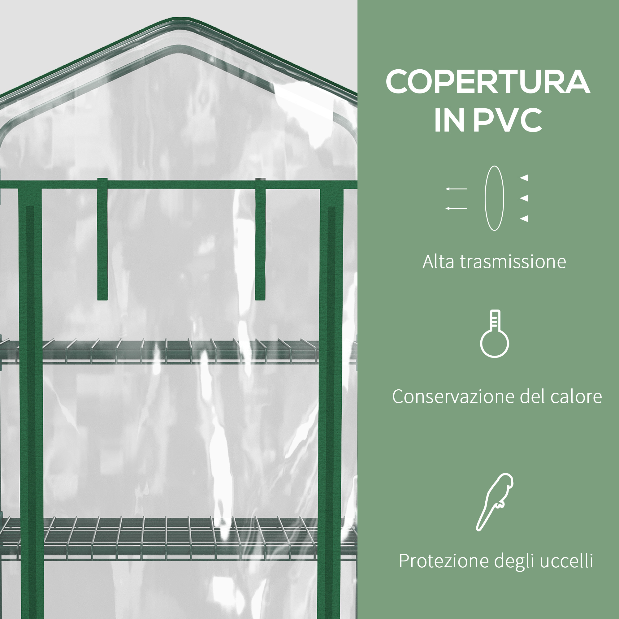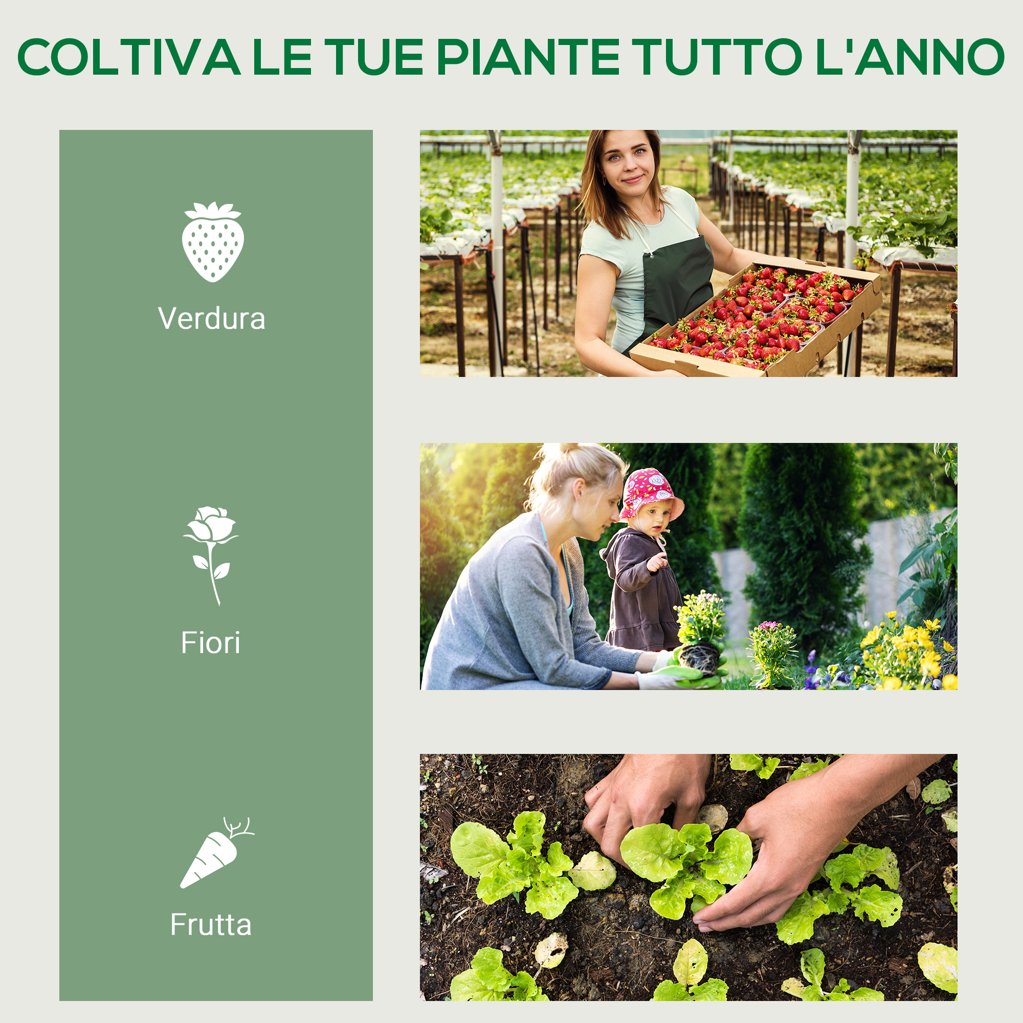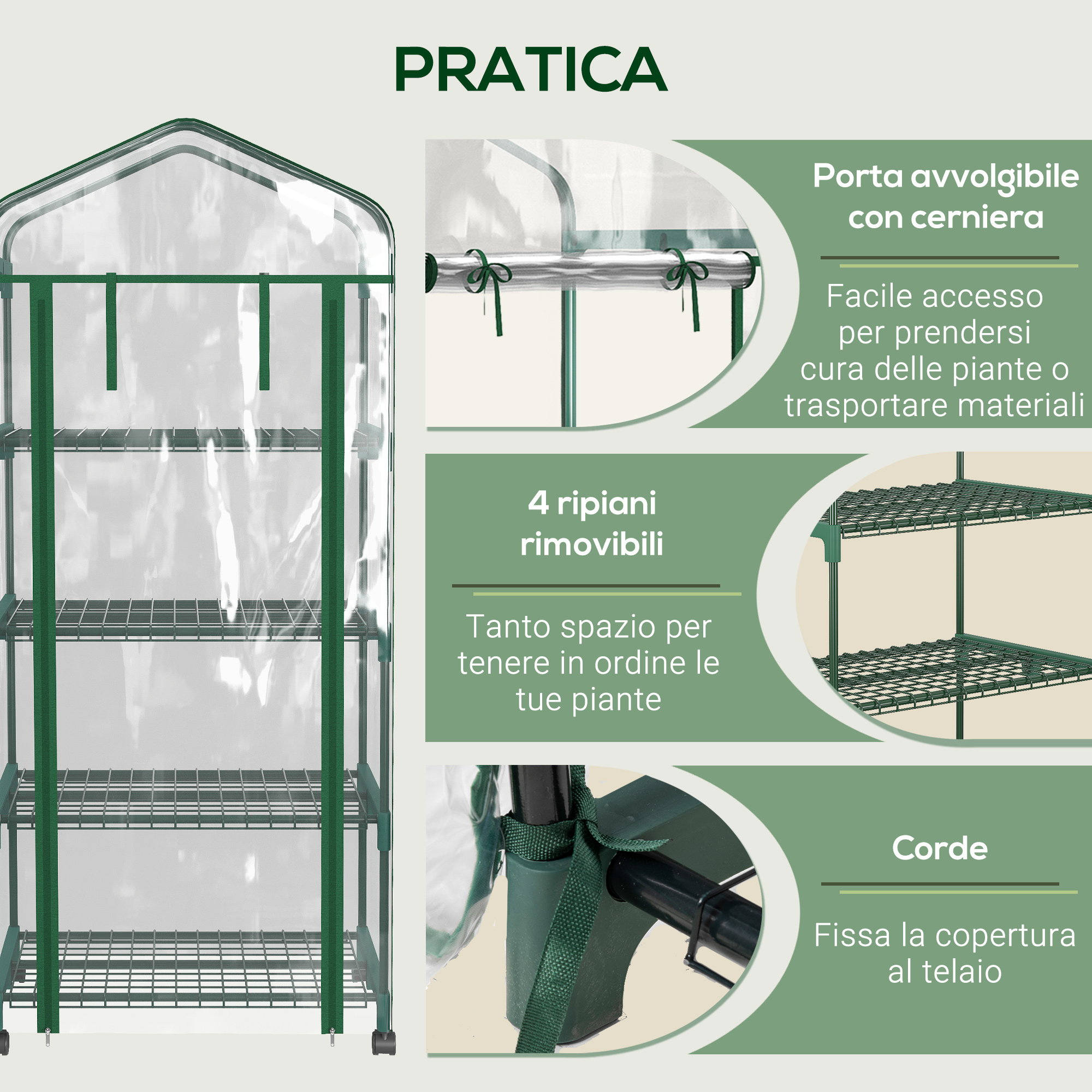 Vuoi coltivare le tue amate piante tutto l’anno? La nostra efficiente serra da balcone a 4 livelli ti permette di liberare il tuo pollice verde quando vuoi e dove vuoi grazie alla sua struttura compatta. La copertura è trasparente per permette un migliore passaggio della luce solare e proteggere da caldo e freddo eccessivo, mentre la porta anteriore con doppia zip su entrambi i lati della serra per piante assicura accesso rapido al suo interno.Caratteristiche:• Serra piccola con tubi in acciaio di alta qualità e robusto tessuto a rete in plastica che offre una struttura solida e affidabile• L’ampio spazio interno su 4 livelli permette di ospitare un gran numero di piante e fiori• Serra per piante con 4 ruote e 2 freni per consentire una facile mobilità• Serra da balcone con copertura trasparente che protegge le piante dalle temperature estreme e tiene lontani i parassiti• Porta frontale con zip arrotolabile per un facile accesso all’interno• Facile da montare e sicura, non sono richiesti attrezzi particolariDati tecnici:• Colore: Verde• Materiale: Acciaio, PE• Dimensioni complessive: 69L x 50P x 165A cm• Dimensioni della porta: 50L x 138A cm• Dimensioni del ripiano: 69L x 43P cm• Altezza del livello: 33 cm• Carico massimo (per livello): 10 kgContenuto della confezione:• 1 x Serra da balcone• 1 x Manuale di montaggio