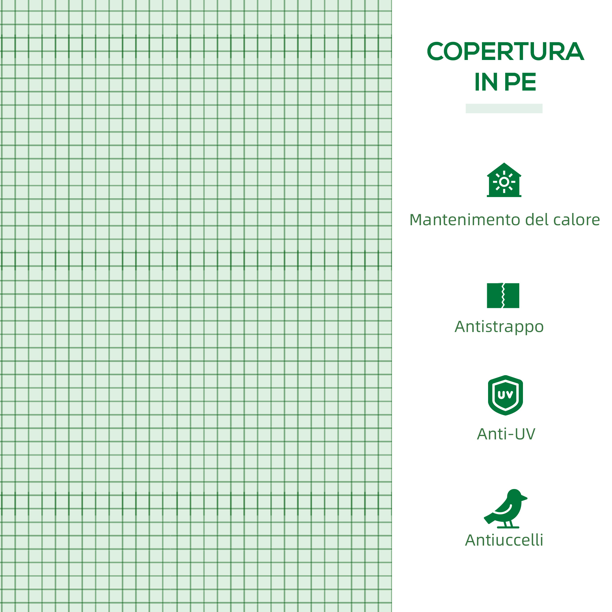 La nostra serra da giardino è il rimedio ideale per prolungare la coltivazione delle tue piante senza preoccuparsi del freddo e degli uccelli. Il suo telaio in acciaio ne assicura la stabilità e la copertura in PE crea una protezione efficace da vento e pioggia mentre trattiene il calore. La struttura è dotata di una porta avvolgibile per entrare e uscire dalla serra per orto, così da poter spostare piante e attrezzi in ogni momento senza problemi.Caratteristiche:• Serra da giardino compatta e perfetta per gli spazi limitati• Piccola serra a ripiani multipli con ganci per il fissaggio• Serra per piante, ortaggi, frutta e fiori• La copertura in PE è resistente ai raggi UV e agli strappi per garantire protezione e durata• Le tasche laterali della copertura possono essere inserite nel terreno e usate per piantare dei fiori• Porta arrotolabile con cerniera che garantisce una buona ventilazione e permette di gestire facilmente le piante• La solida struttura in metallo è resistente• Montaggio richiestoDati tecnici:• Colore: Verde scuro• Materiale: Metallo, PE• Dimensioni generali: 69L x 49P x 158A cm• Misure porta: 50L x 134A cm• Misure ripiani: 62L x 48P cm• Altezza ripiani: 0 cm, 32 cm, 64 cm, 96 cm (dal basso verso l’alto)• Capacità di carico: 15kg (ciascun ripiano)• Livello di resistenza al vento: 4• NOTA BENE: Si prega di non usare prodotti chimici aggressivi per evitare reazioni con la copertura in PE, che potrebbero causarne la rotturaContenuto della confezione:• 1 x Serra da giardino• 8 x Ganci• 1 x Manuale di istruzioni