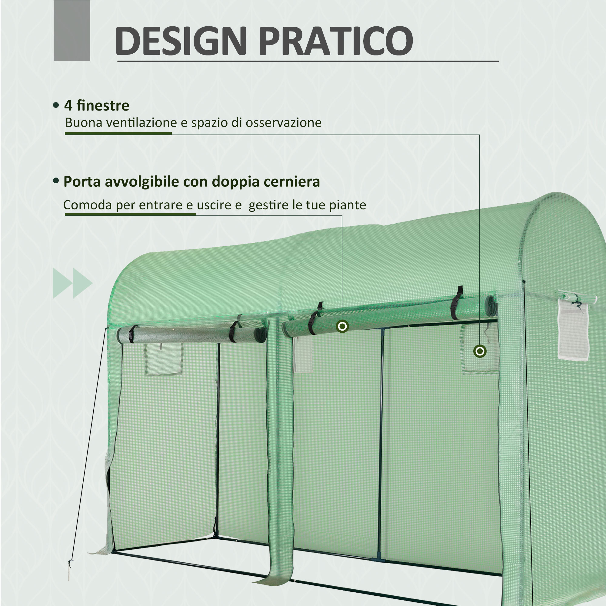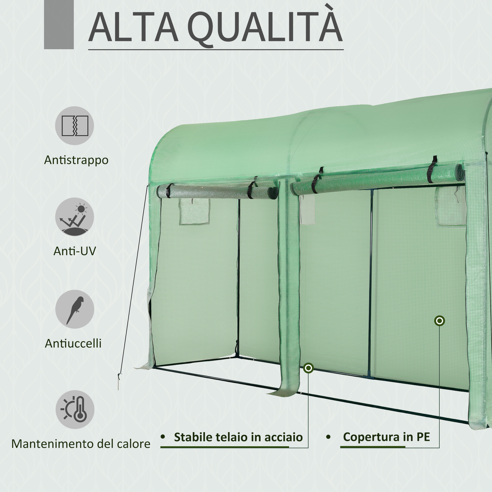 Questa grande serra a tunnel per il tuo giardino sarà in grado di aiutarti a proteggere tutte le tue piante dalla pioggia, dal vento, dai danni degli uccelli e dalla luce solare intensa. La struttura in acciaio galvanizzato e il telo in PE impermeabile garantiscono inoltre una protezione a lungo termine.Caratteristiche:• Serra da giardino ideale per la coltivazione di frutta e verdura, fiori, ecc.• Telo per serra in polietilene ad alta densità 140 g/m², impermeabile e anti-UV con 20 cm di estensione per consentire un’installazione facile e duratura• Serra a tunnel che offre un’eccellente protezione contro il freddo, gli insetti, gli uccelli, i raggi UV, ecc.• 4 archi e 2 tubi di rinforzo laterali per ottimizzare la rigidità e la robustezza• Serra per orto con 6 finestre laterali arrotolabili con zanzariere (cordino di attacco per ciascuna) e porta a rullo con zip per adattarsi perfettamente alle condizioni climatiche (necessità di ventilare o chiudere)• Telaio in acciaio galvanizzato• Facile da montare, manuale incluso• Si prega di non utilizzare pesticidi per evitare di danneggiare il telone• È consigliato interrare le estremità del telone per una maggiore rigidità della strutturaDati tecnici:• Colore: Bianco• Materiale: Acciaio zincato, polietilene ad alta densità 140 g/m²• Dimensioni complessive: 3.5L x 3P x 2A m• Dimensioni delle finestrelle: 35L x 35P cm• Dimensioni della porta: 170L x 170A cm• Diametro: Ø1.9 cm• Consegna effettuata in un unico pacco.Contenuto della confezione:• 1 x Serra a tunnel• 1 x Manuale di istruzioni​​