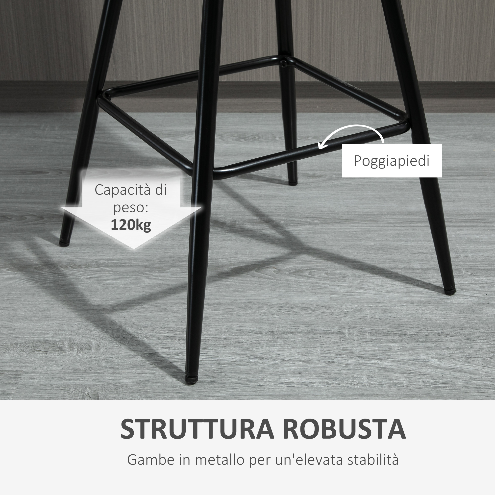 Porta un tocco di novità nei tuoi spazi domestici con questo set di sgabelli imbottiti , l’ideale per ravvivare ogni ambiente. Il look semplice e lo stile nordico li rende ideali da usare in soggiorno e in cucina, oppure come sgabelli da bar nella tua attività. Il tessuto effetto velluto e l’imbottitura in gommapiuma rendono la seduta confortevole, mentre lo schienale curvo e il poggiapiedi ti aiutano a mantenere una postura corretta.Caratteristiche:• Set da 2 sgabelli alti per la tua casa• Sgabelli da cucina in stile nordico per donare un tocco di originalità a ogni arredamento• Sgabelli moderni con cuciture decorative e di rinforzo alla seduta• Sgabelli imbottiti per il massimo comfort• Schienale curvato ergonomico e poggiapiedi integrato per mantenere una postura comoda e rilassata• Morbido rivestimento in tessuto effetto velluto durevole e facile da pulire• Montaggio richiestoDati tecnici:• Colore: Nero• Materiale: Tessuto effetto velluto (poliestere), metallo• Dimensioni generali: 45L x 47P x 84A cm• Dimensione seduta: 42.5L x 35P cm• Altezza seduta: 61 cm• Dimensione schienale: 42.5L x 22.5A cm• Capacità di peso: 120 kgContenuto della confezione:• 2 x Sgabelli da cucina• 1 x Manuale di istruzioni​​