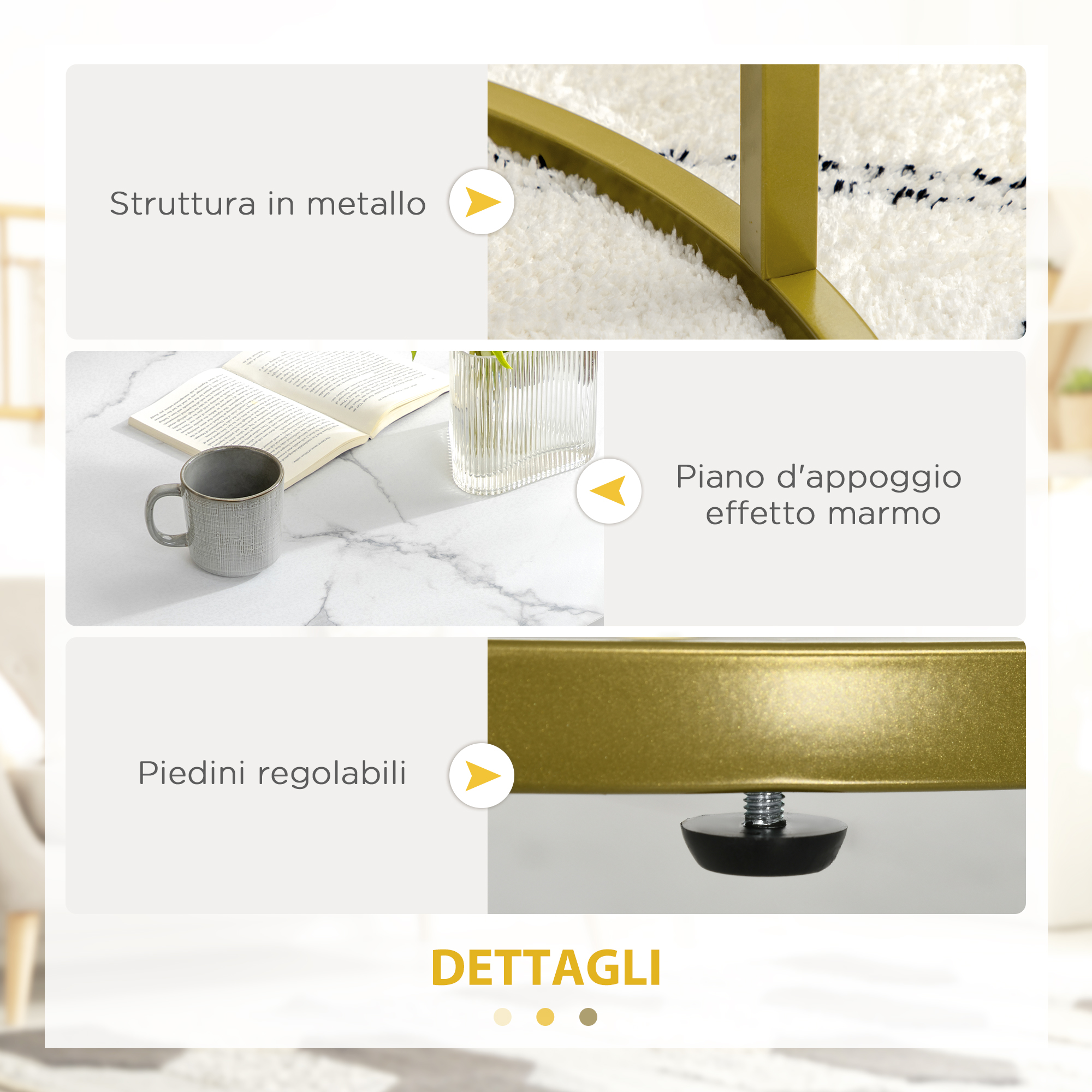 Questi due tavolini da caffè impilabili aggiungono stile ed eleganza al tuo spazio interno. Il set di tavolini può essere separato o utilizzato indipendentemente in soggiorno, camera da letto e anche in ufficio. La struttura in acciaio e il piano del tavolo in truciolato possiedono una struttura robusta e facile da pulire. Lascia che questi due tavolini moderni annidati, eleganti e funzionali ti aiutino a trascorrere dei pomeriggi all’insegna del relax e del benessere.Caratteristiche:• Piani del tavolo in truciolato e struttura in acciaio per reggere fino a 15kg per tavolo• Design impilabile ma anche ad uso indipendente• Utilizzabili come tavolino da divano, tavolino da caffè o comodino• I piedini regolabili danno stabilità e protezione• Montaggio richiestoDati tecnici:• Colore: Bianco, oro• Materiale: Acciaio, truciolato• Dimensioni complessive: 45L x 45P x 50Acm (tavolo grande), 37L x 37P x 43Acm (tavolo piccolo)• Spessore del piano del tavolo: 15 mm• Capacità di peso: 15 kg (per tavolo)Contenuto della confezione:• 1 x Tavolino da caffè grande• 1 x Tavolino da caffè piccolo• 1 x Manuale di istruzioni