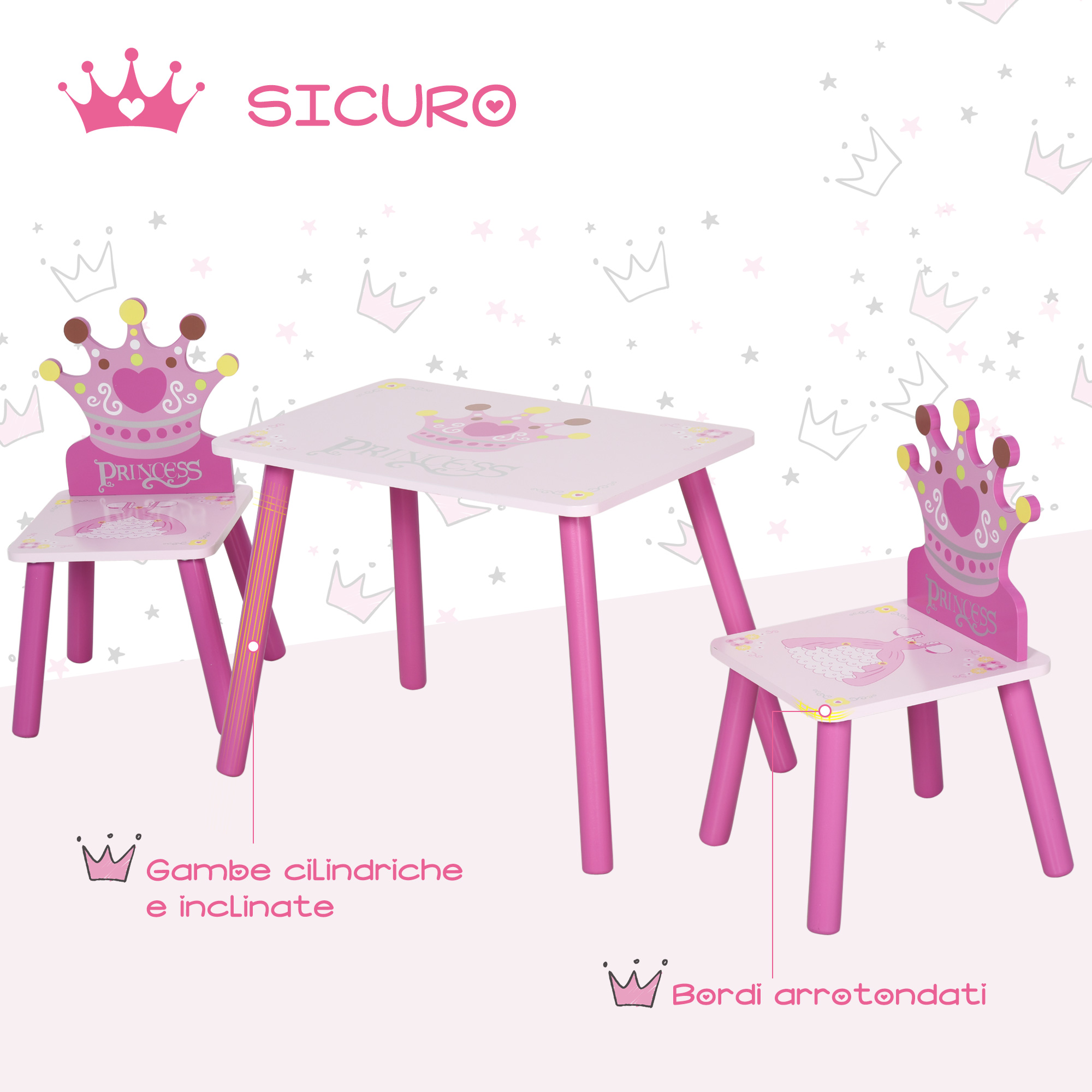 Set Tavolo e 2 Sedie a Tema Principesse per Cameretta Bambini in Legno Rosa con Schienale a Forma di Corona
