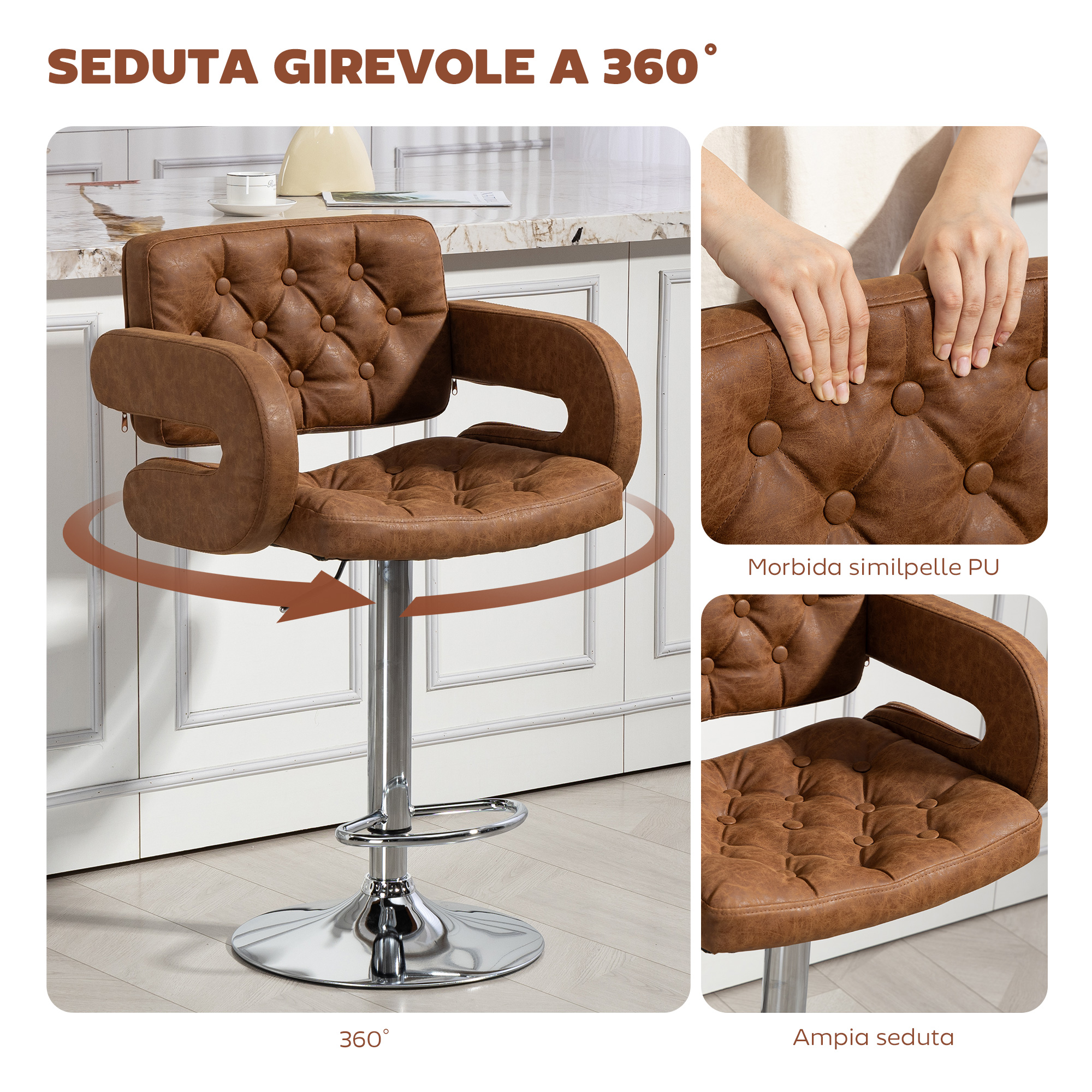 Sgabello da Bar con Schienale e Braccioli, Altezza Regolabile e Poggiapiedi, Finta Pelle Marrone