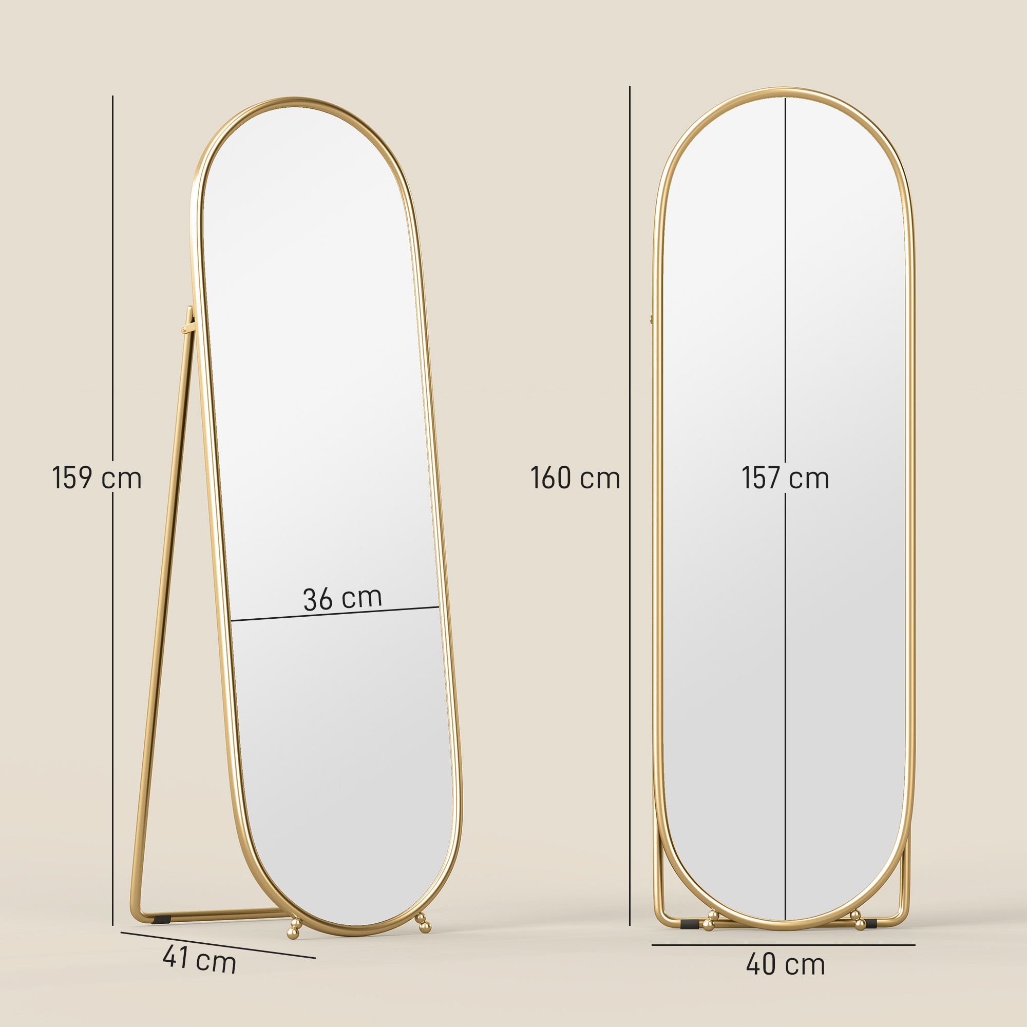 Specchio Verticale Ovale da Terra con Supporto, in Vetro e Metallo, 40x41x159 cm, Tonalità Oro