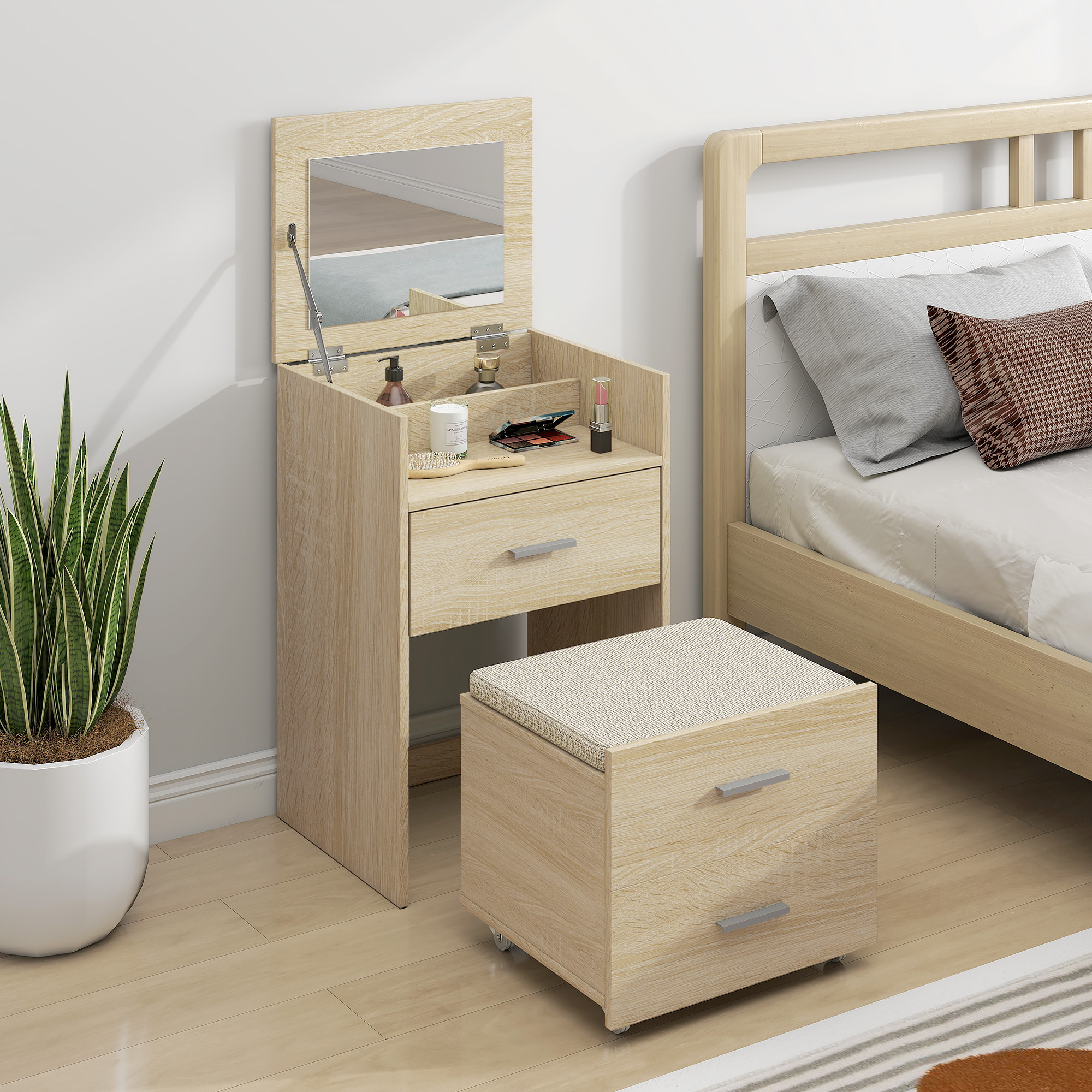 Tavolo da Trucco con Specchio a Ribalta, Cassetti e Sgabello, in Legno e Tessuto Effetto Lino, color Legno