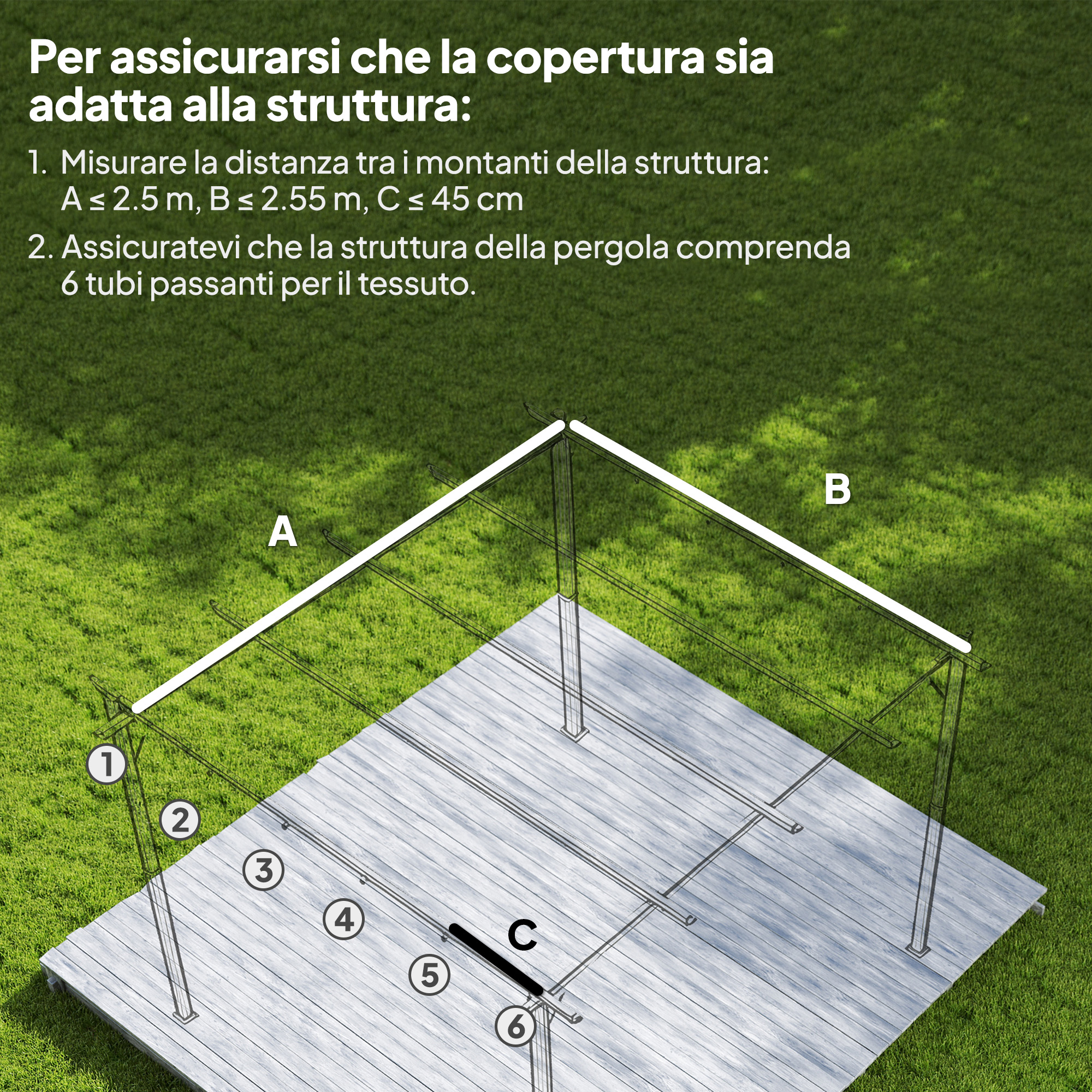 Regala un nuovo look al tuo gazebo pergola con questa bella copertura per gazebo . Realizzato in poliestere rivestito in PA, questo telo per gazebo protegge il tuo spazio mentre sarà utilizzato per tutte le tue attività all’aperto. Grazie ai fori su ogni estremità, il tettuccio può essere facilmente installato o rimosso in modo semplice e veloce. La tettoia è inoltre dotata di 10 fori per favorire il drenaggio della pioggia, in modo da non doversi preoccupare dell’accumulo di acqua.Caratteristiche:• Tetto per gazebo adatto alla pergola da giardino 4×3 m (codice prodotto: 84C-055BK)• 10 fori di scarico per favorire il drenaggio dell’acqua• Il tessuto traspirante della copertura per gazebo garantisce un buon flusso d’aria• La confezione include solo il telo, occorre misurare le dimensioni della pergola gazebo prima dell’acquisto• Questa copertura ha fori a sufficienza solo per 6 sbarre Dati tecnici:• Colore: Grigio chiaro• Materiale: Poliestere• Dimensioni complessive: 350L x 260P cm• Ricambio adatto per gazebo a pergola 4×3 mContenuto della confezione:• 1 x Tetto per gazebo;